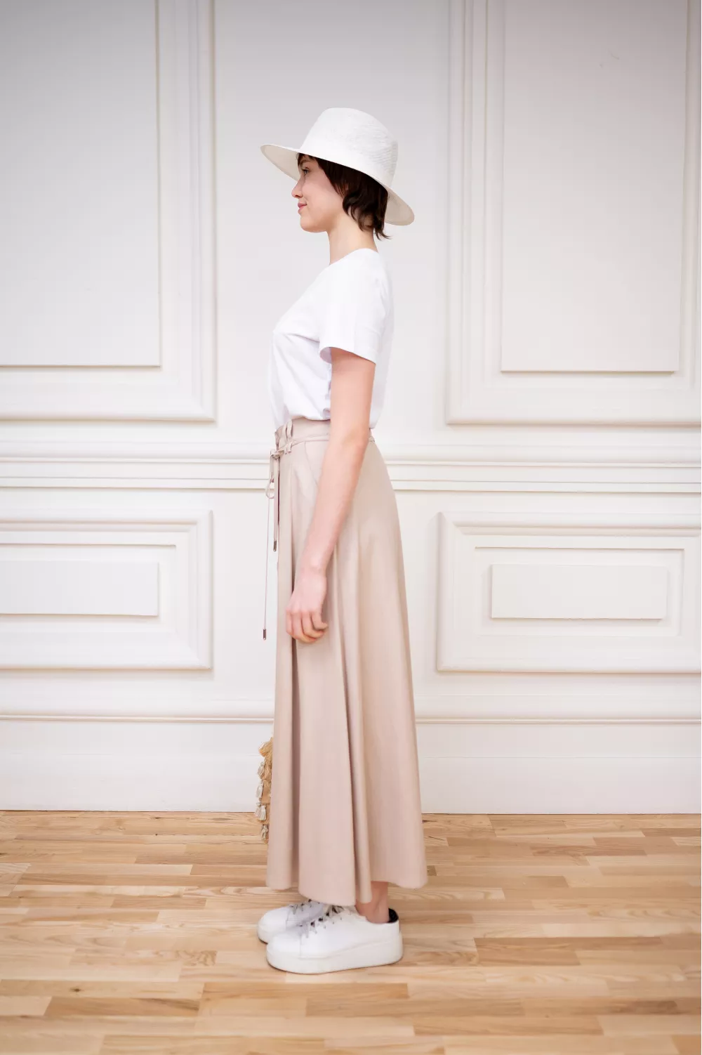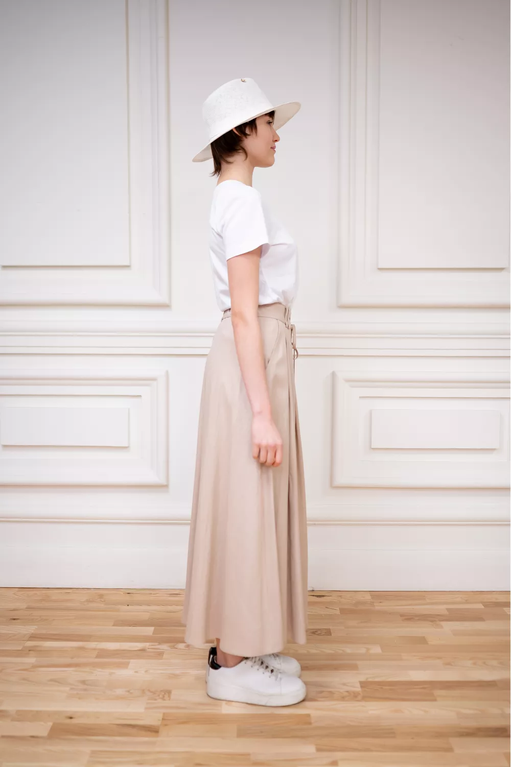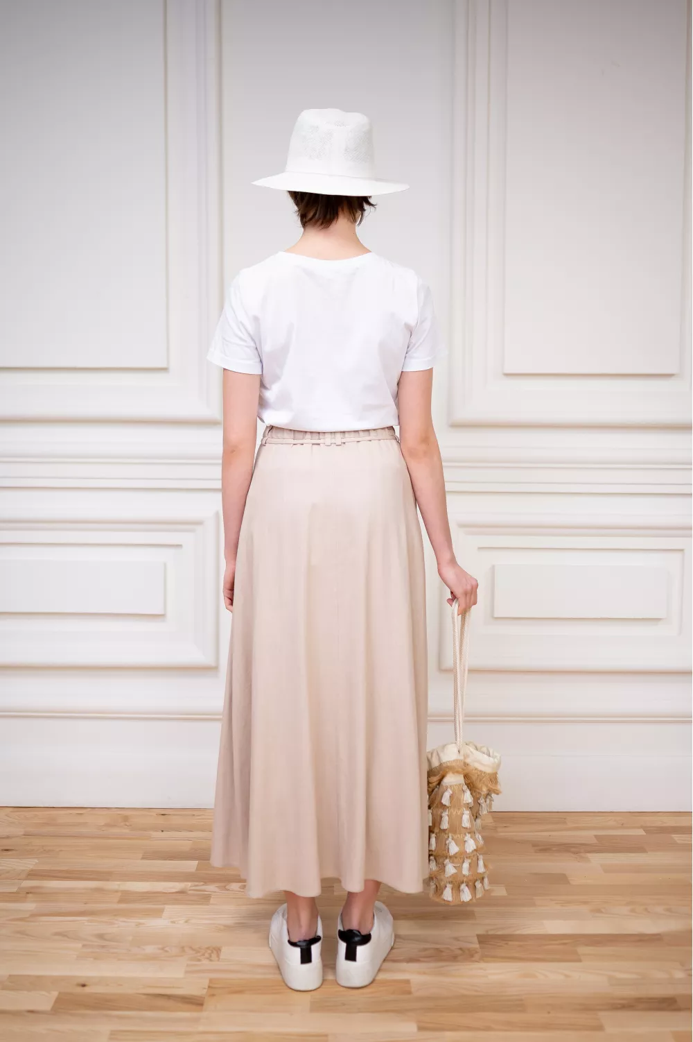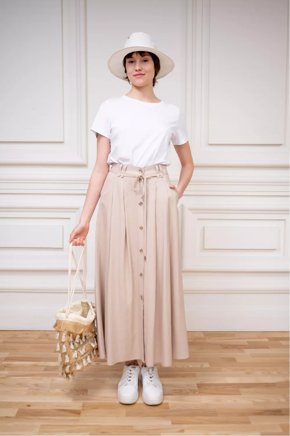 Базовая модель юбки, уже успевшая стать фаворитом этого сезона. Имеет идеальную посадку по талии и создает легкость в любых ваших движениях за счет льняной натуральной ткани и покроя солнце-клеш.