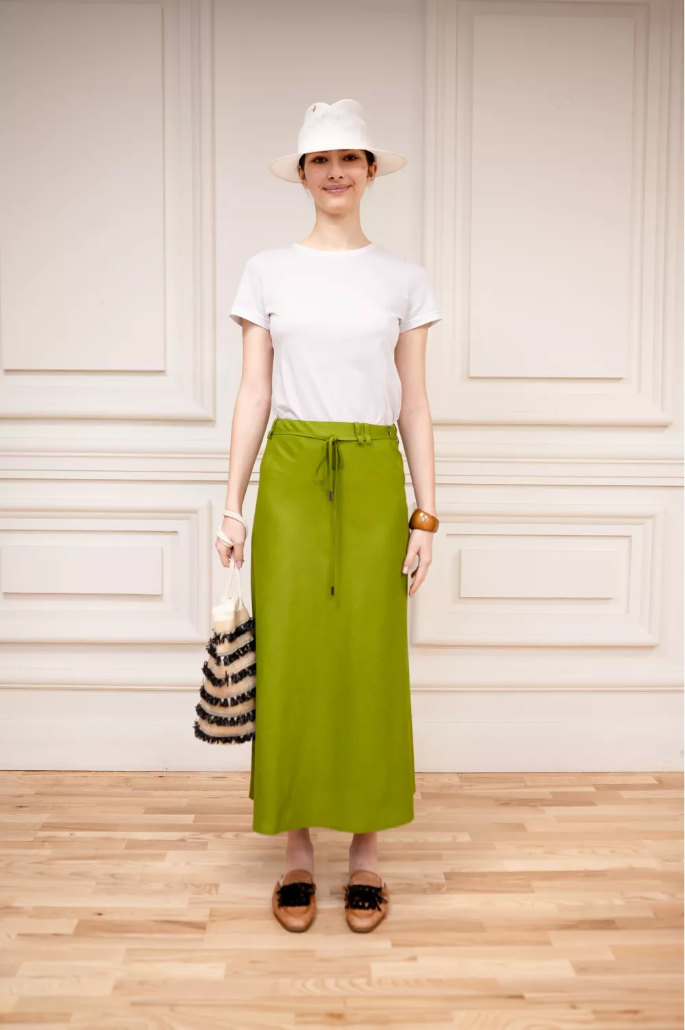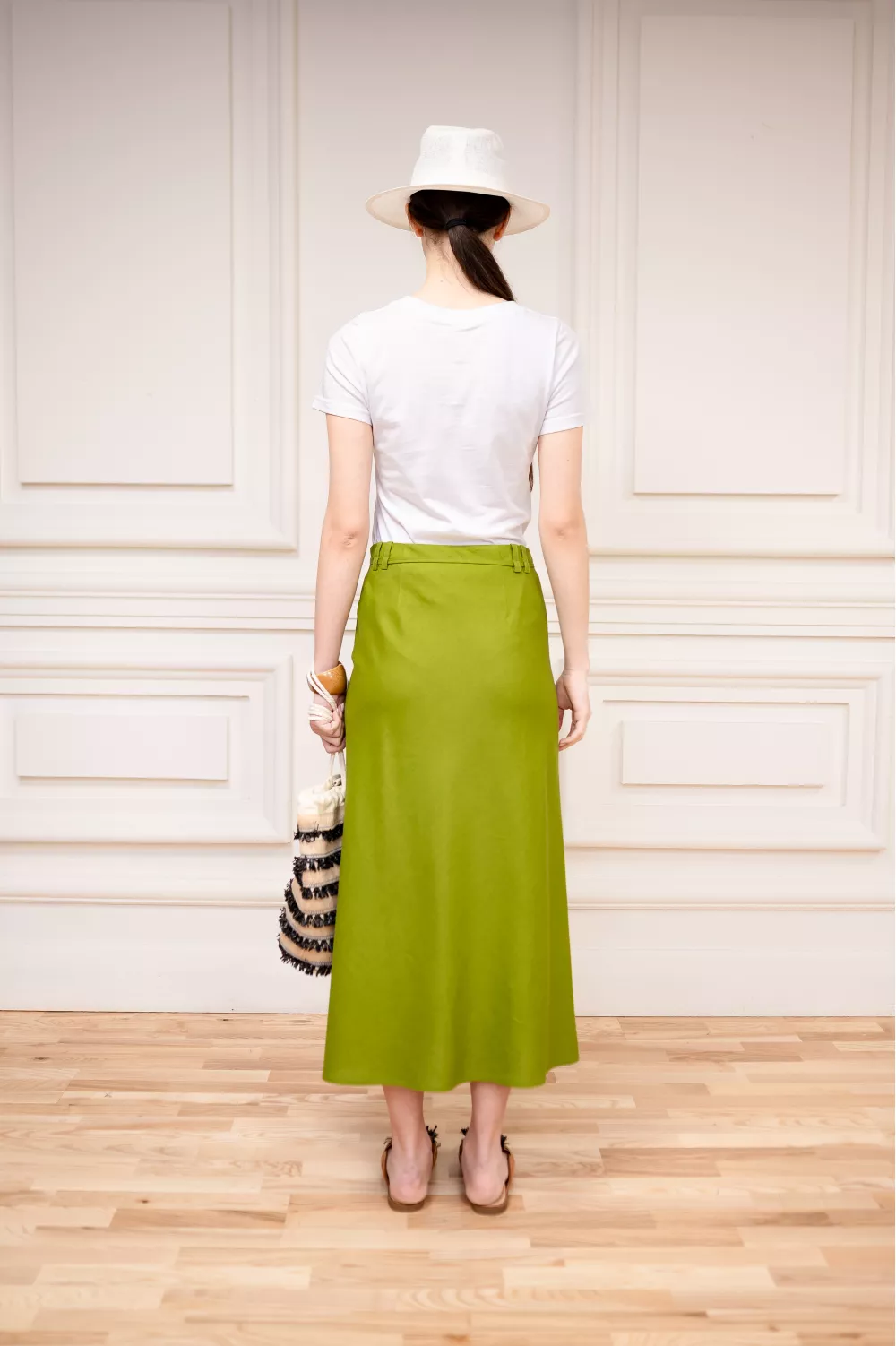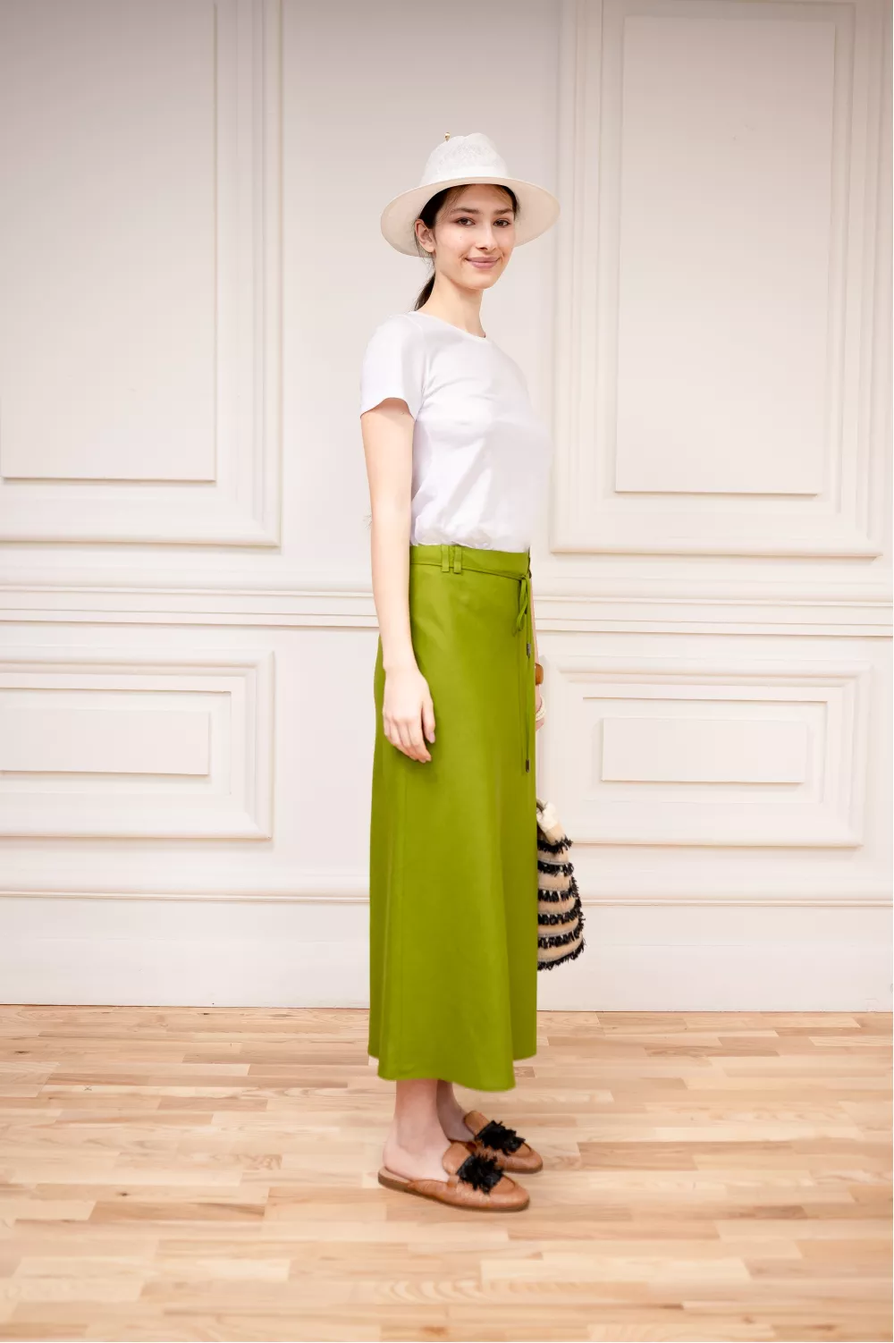 Базовая модель юбки на каждый день по косой создает эффект струи ткани и обеспечивает легкость в движениях.
