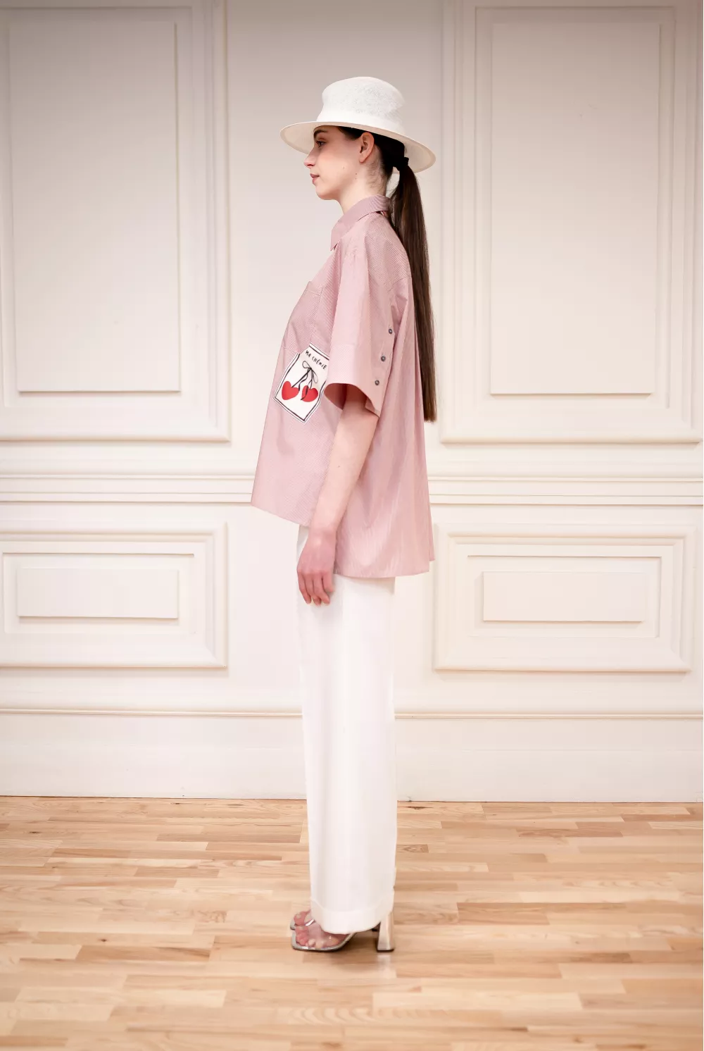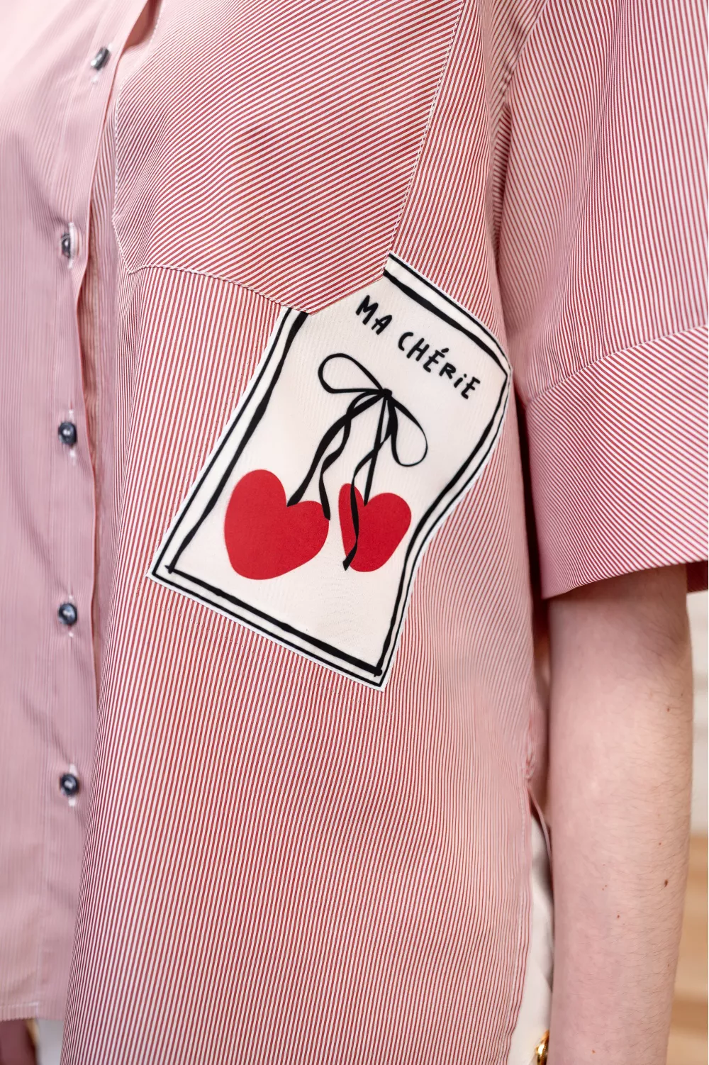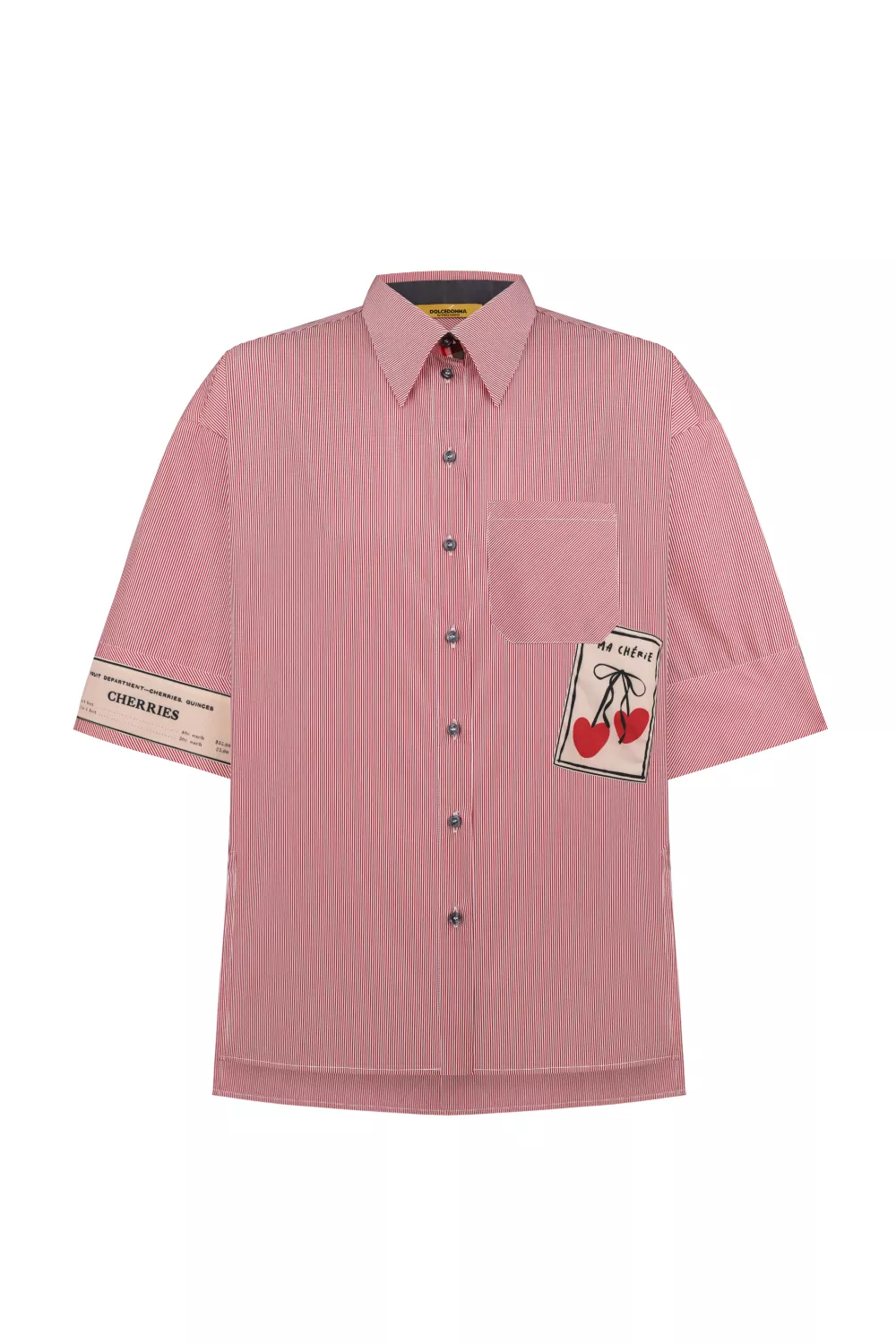Стилизованная модель рубашки с принтом на рукаве и под нагрудным карманом. Широкий рукав и натуральная хлопчатобумажная ткань создают комфорт в солнечные дни.