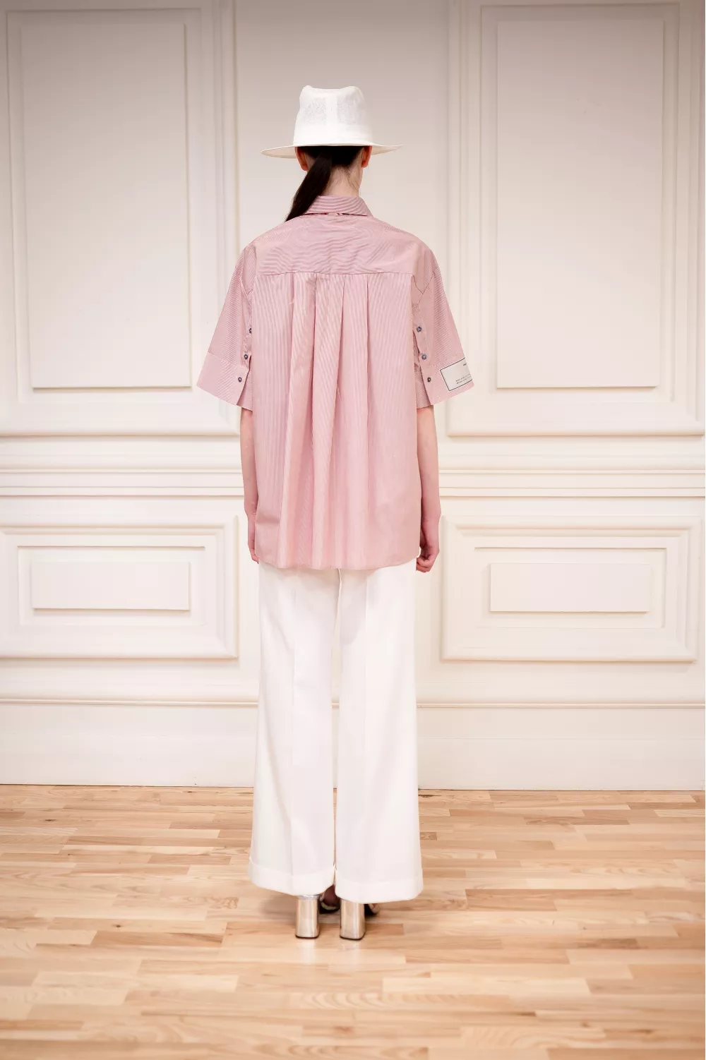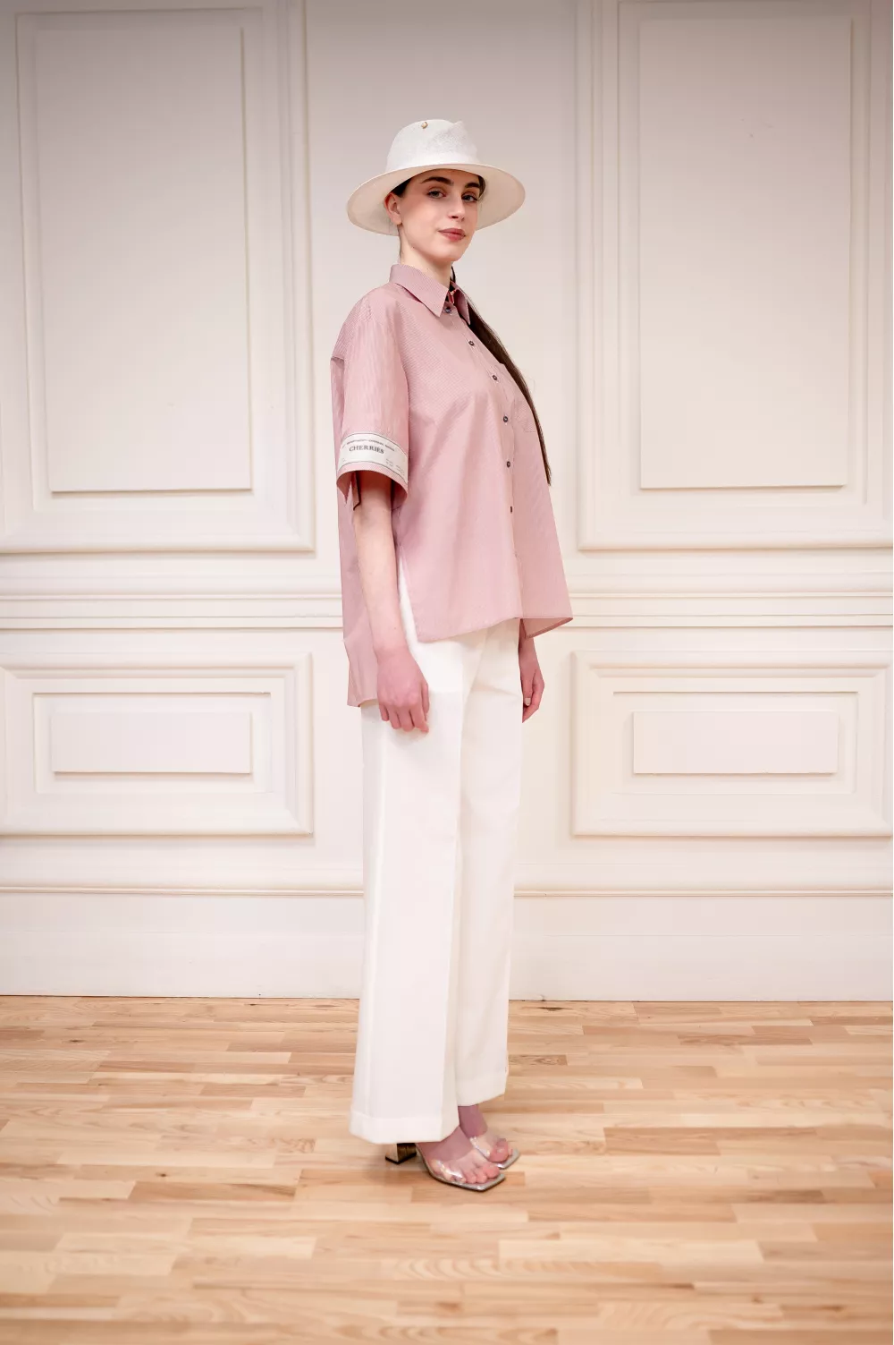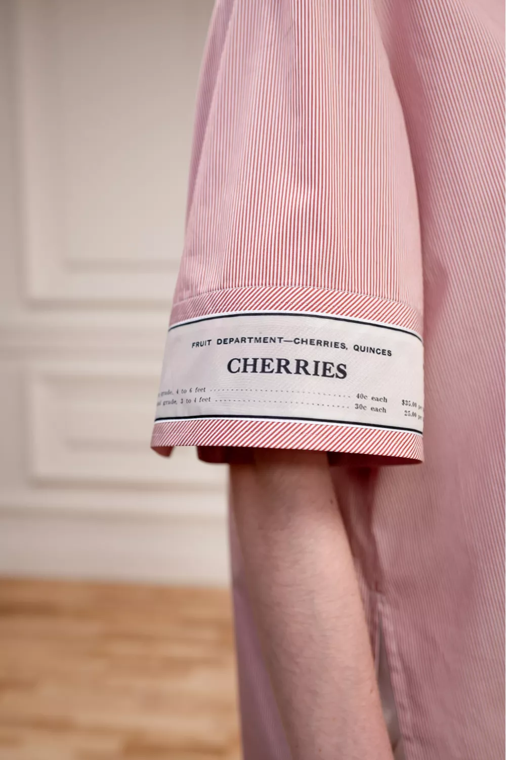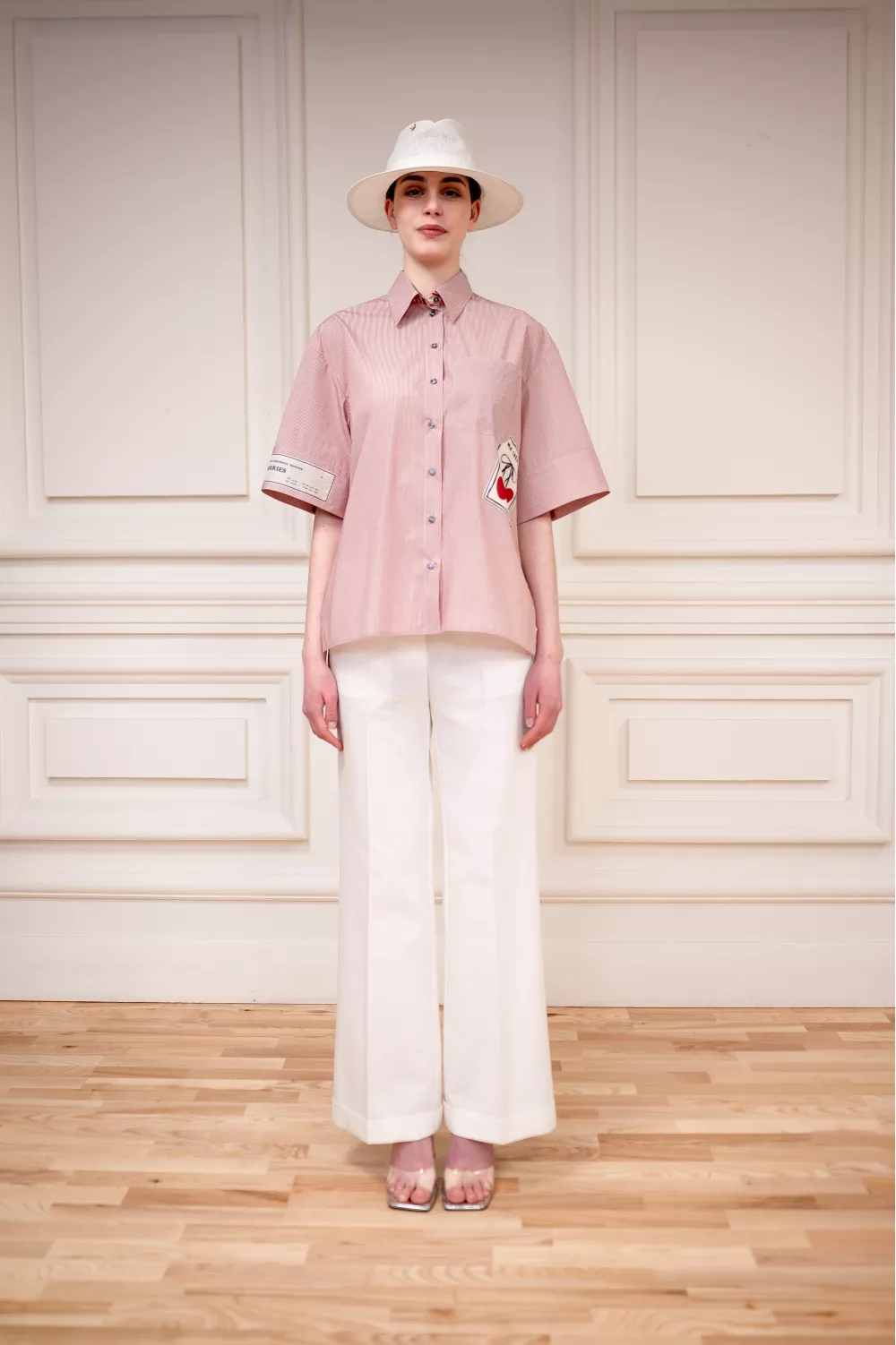 Стилизованная модель рубашки с принтом на рукаве и под нагрудным карманом. Широкий рукав и натуральная хлопчатобумажная ткань создают комфорт в солнечные дни.