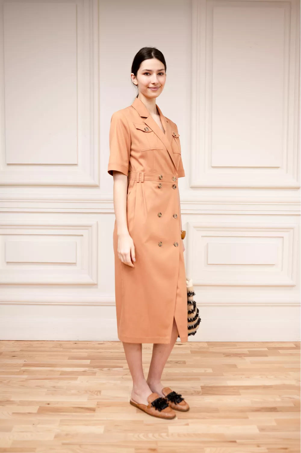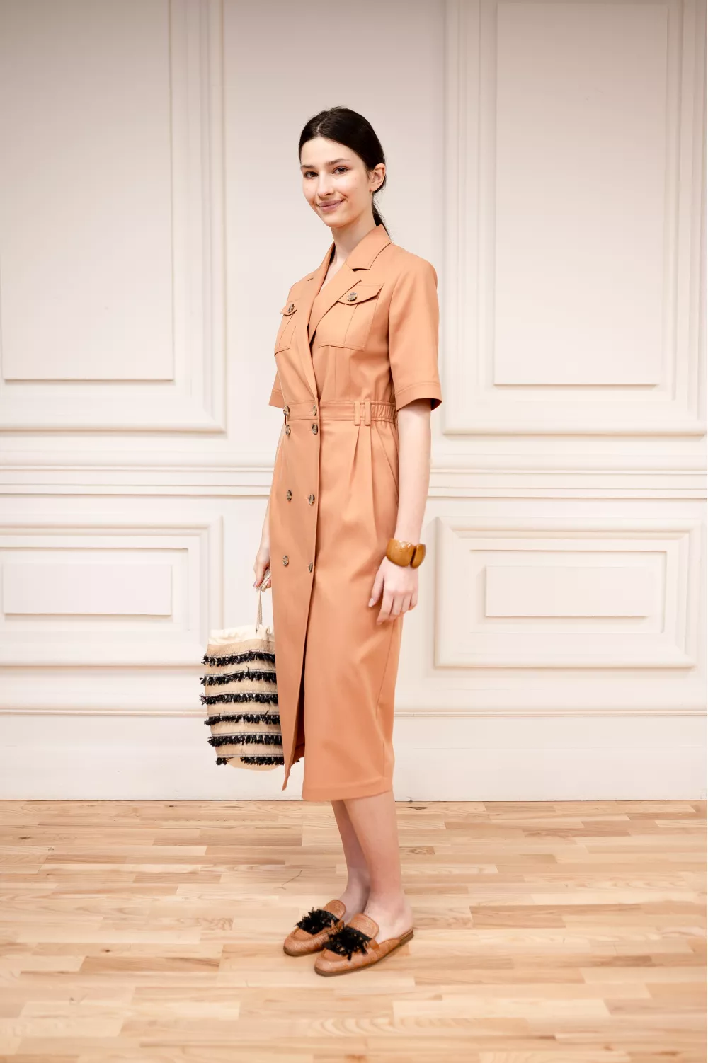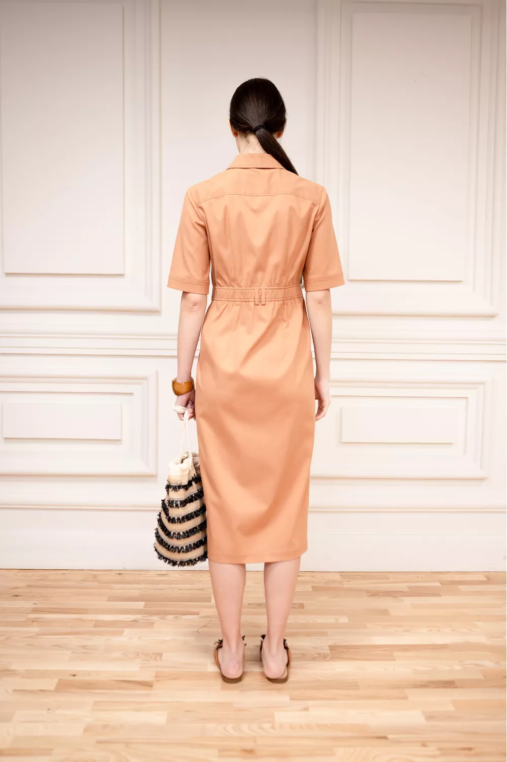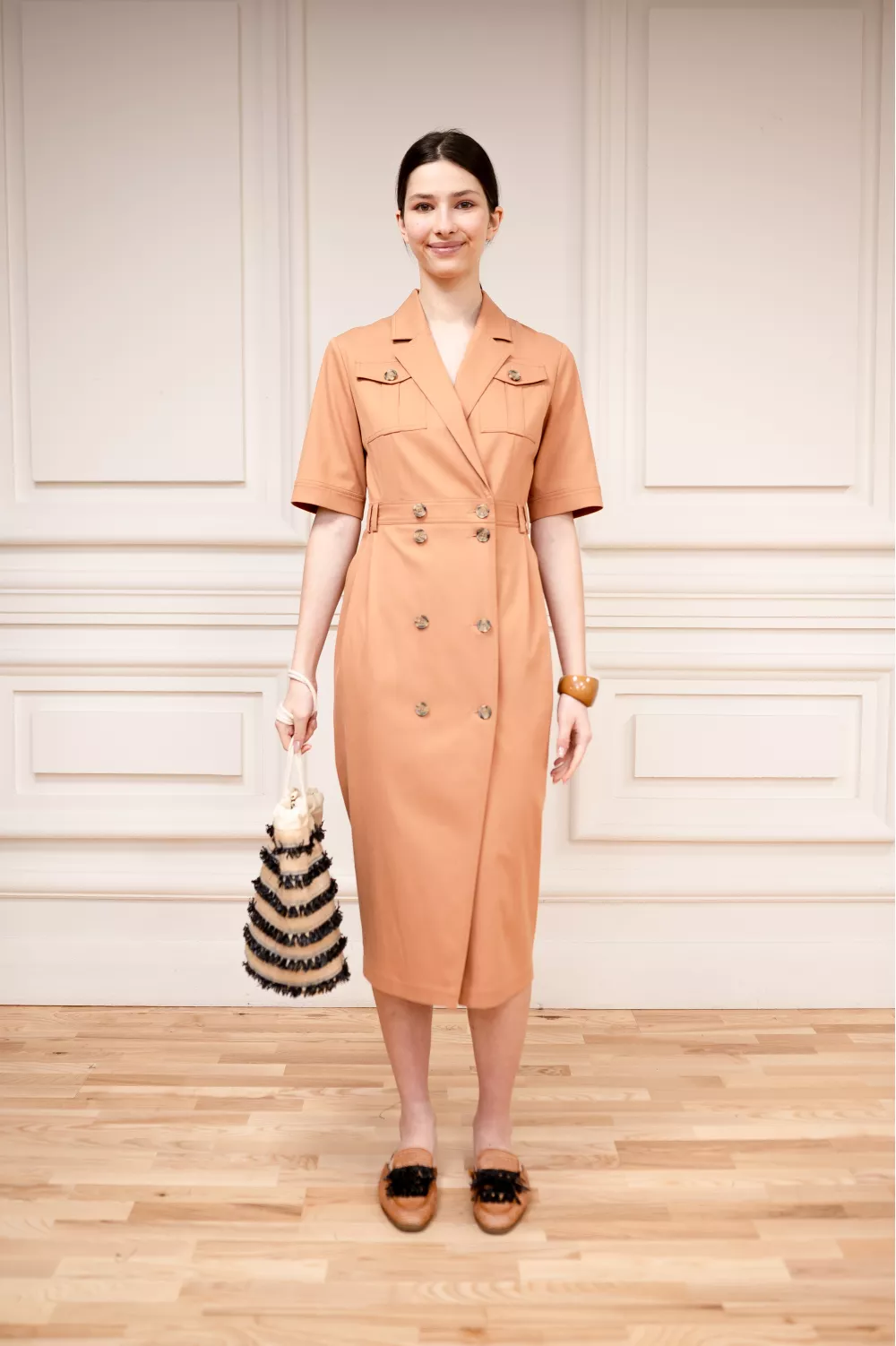 Деловое платье в стиле сафари с асимметричным выраженным разрезом и приталенным покроем позволяет относить эту модель к разным стилям своего гардероба.