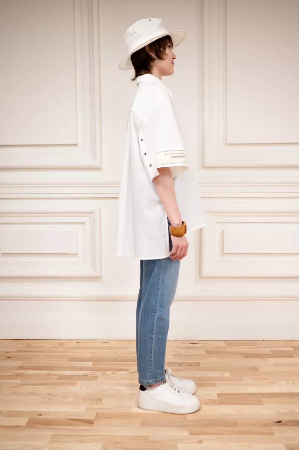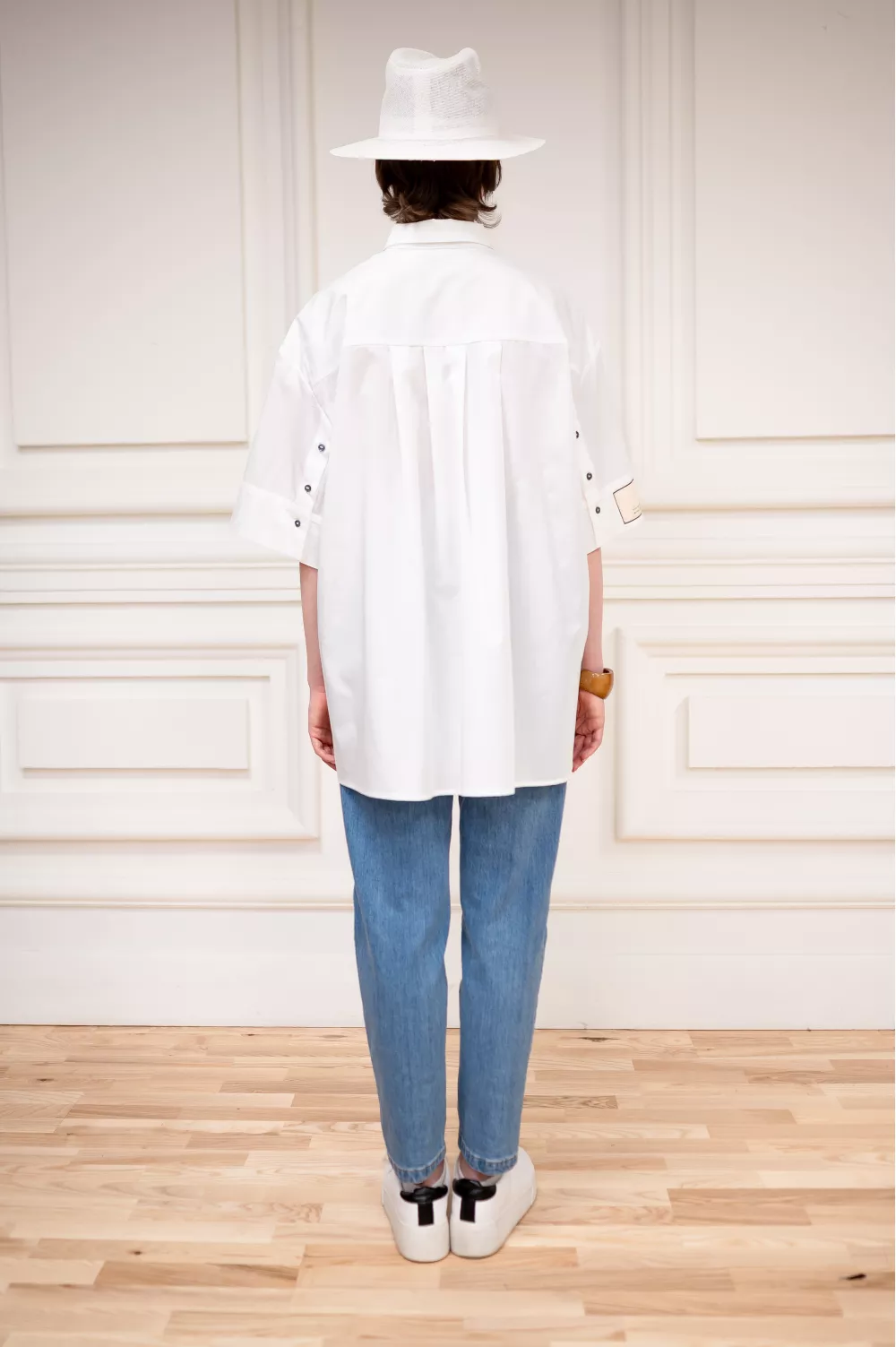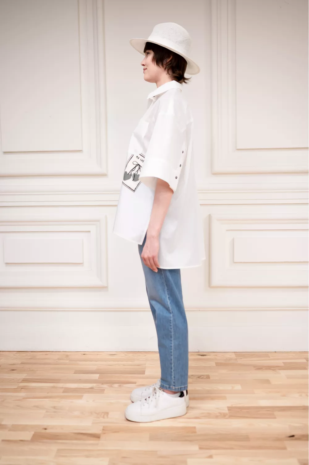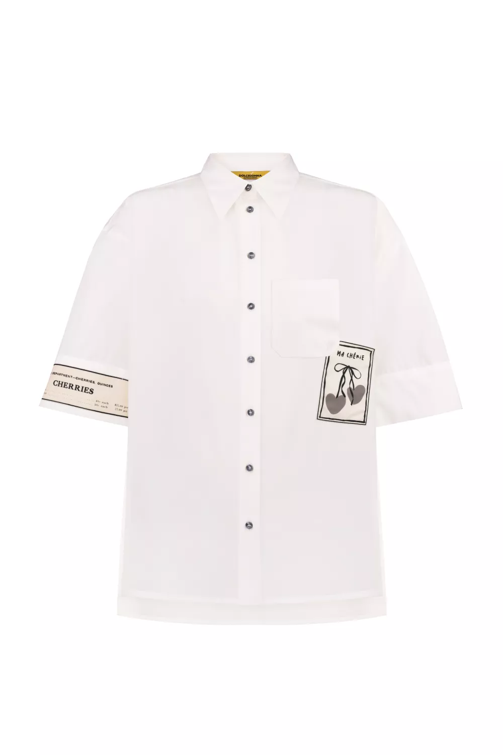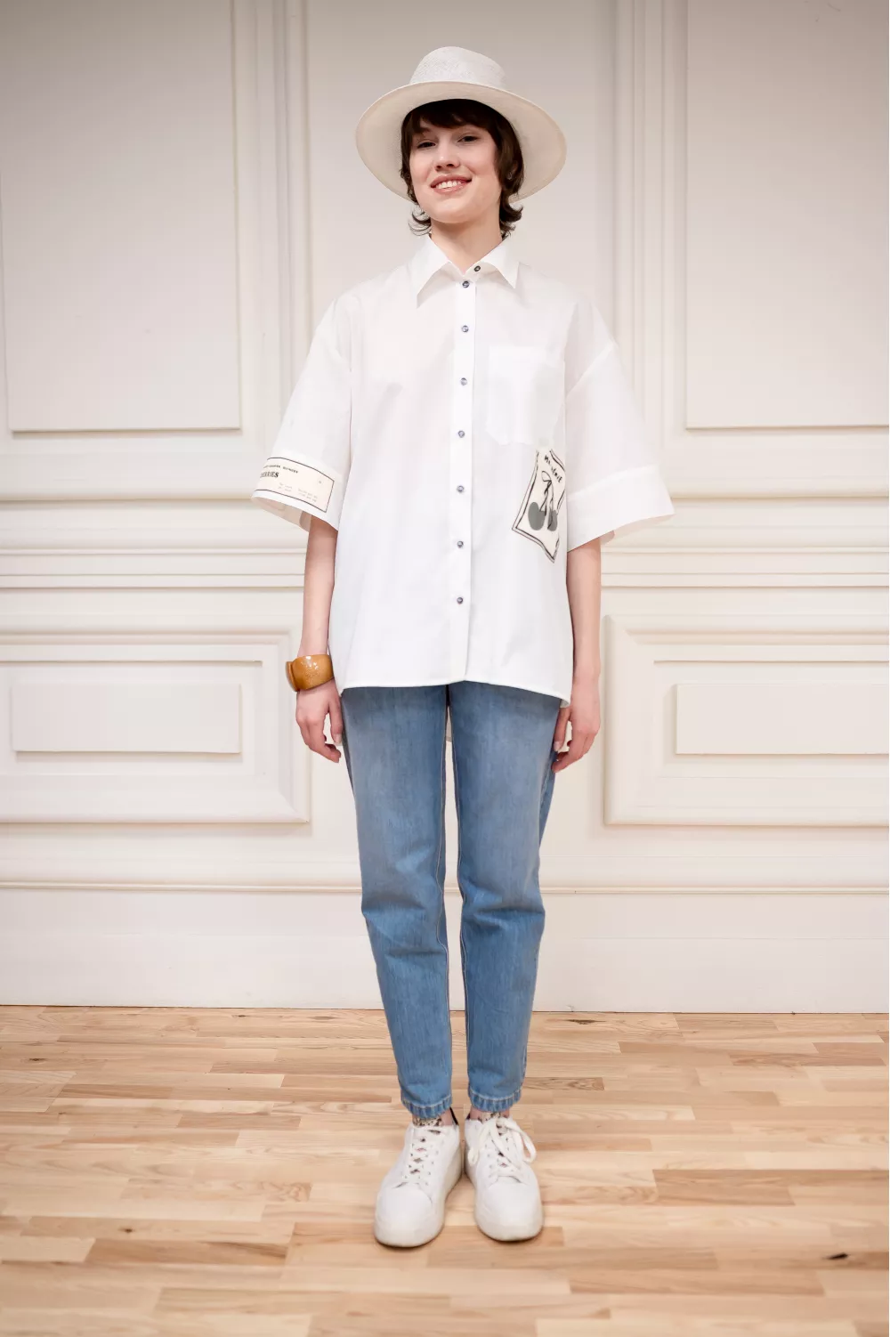 Стилизованная модель рубашки с принтом на рукаве и под нагрудным карманом. Широкий рукав и натуральная хлопчатобумажная ткань создают комфорт в солнечные дни.