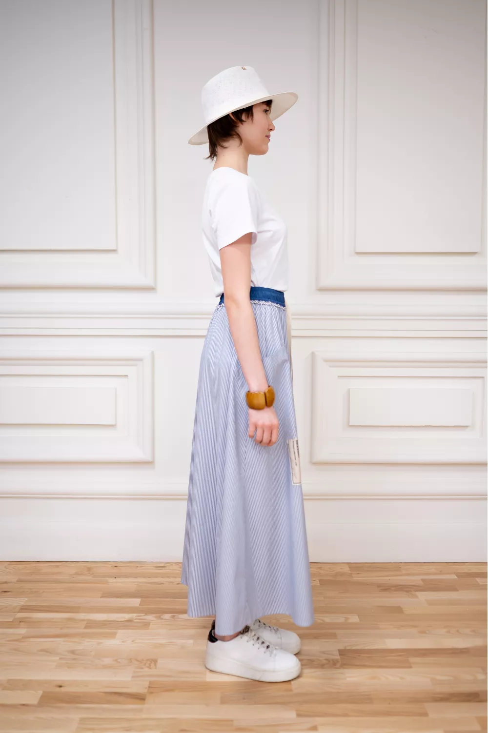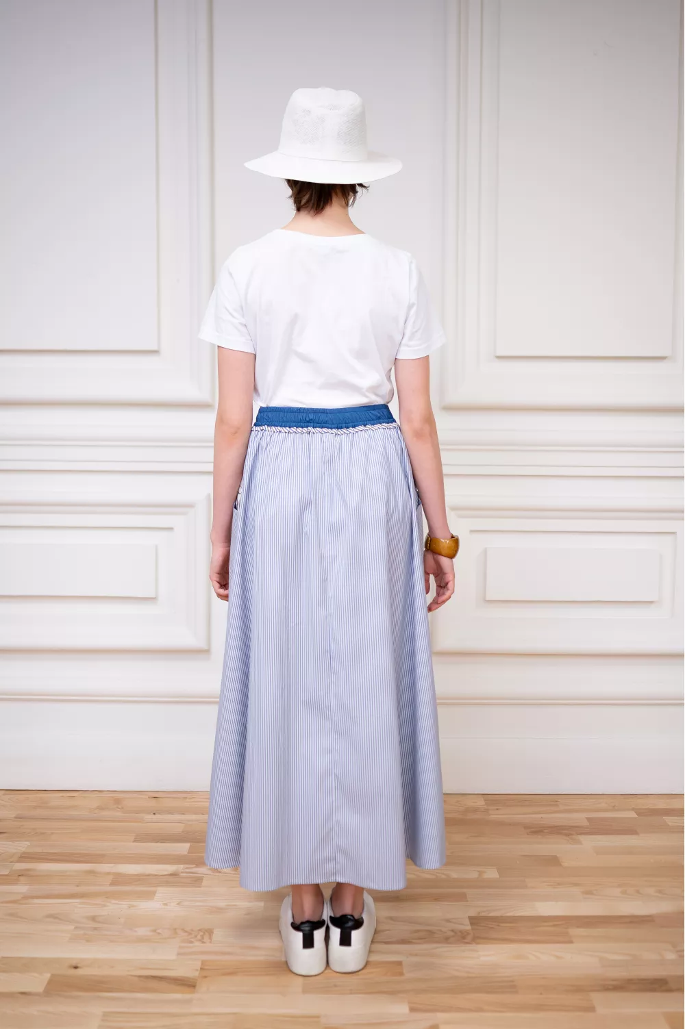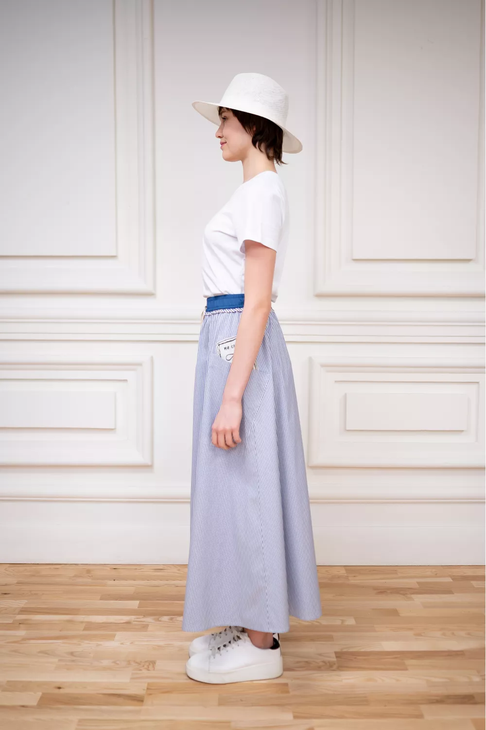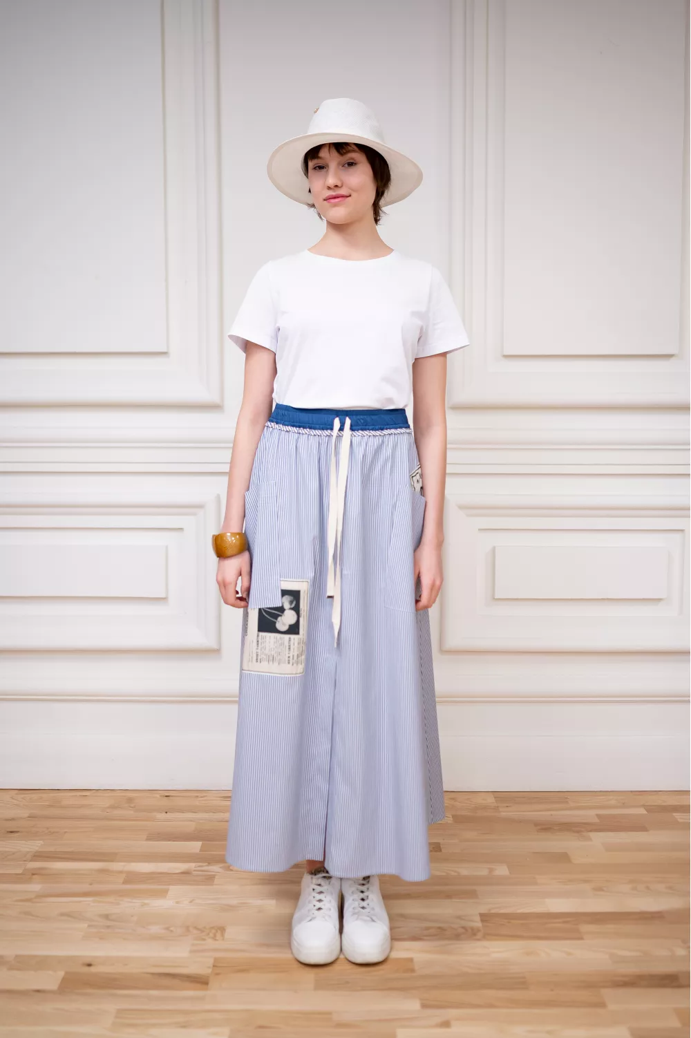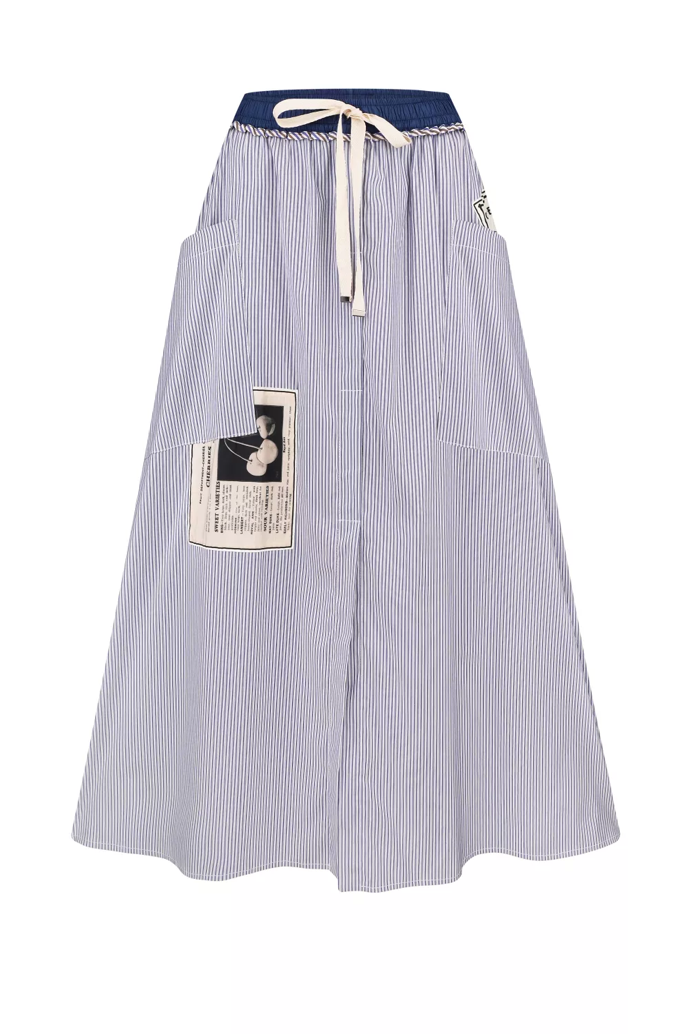 Летняя юбка на резинке украшена принтованными элементами и мелкой полоской. Хорошо сочетается с базовыми футболками и майками
