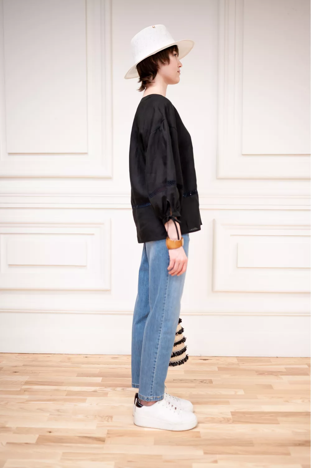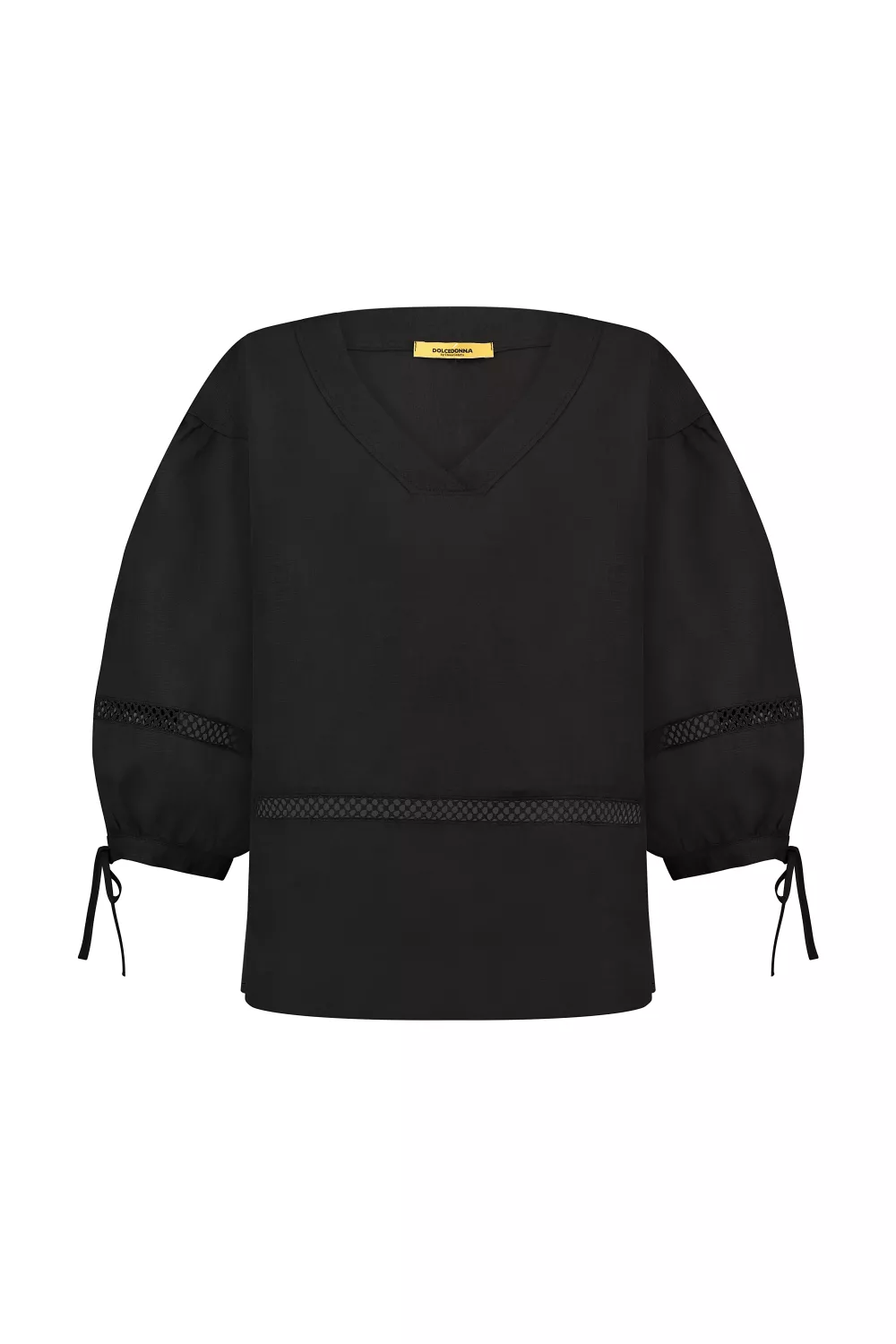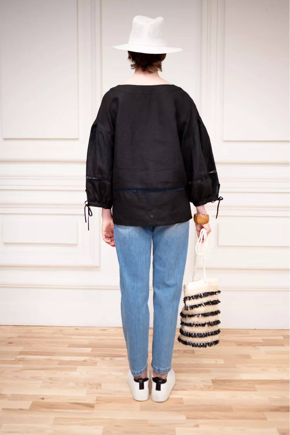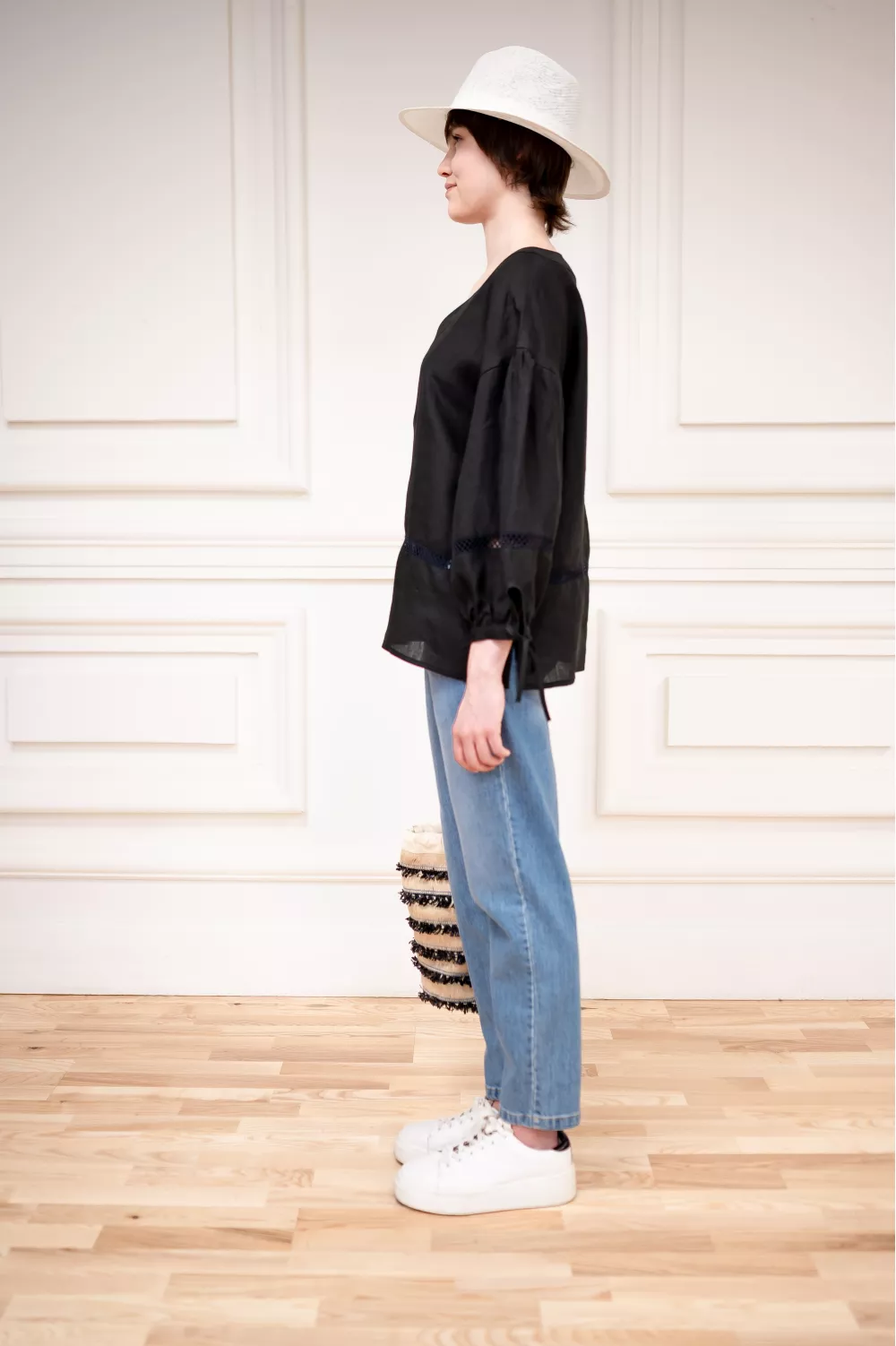 Удобная летняя модель блузы из натурального льна с свободным покроем и пышным фактурным рукавом.