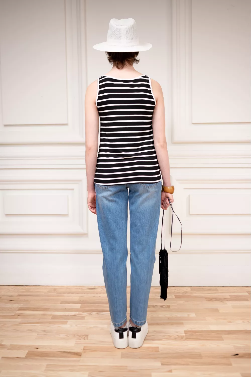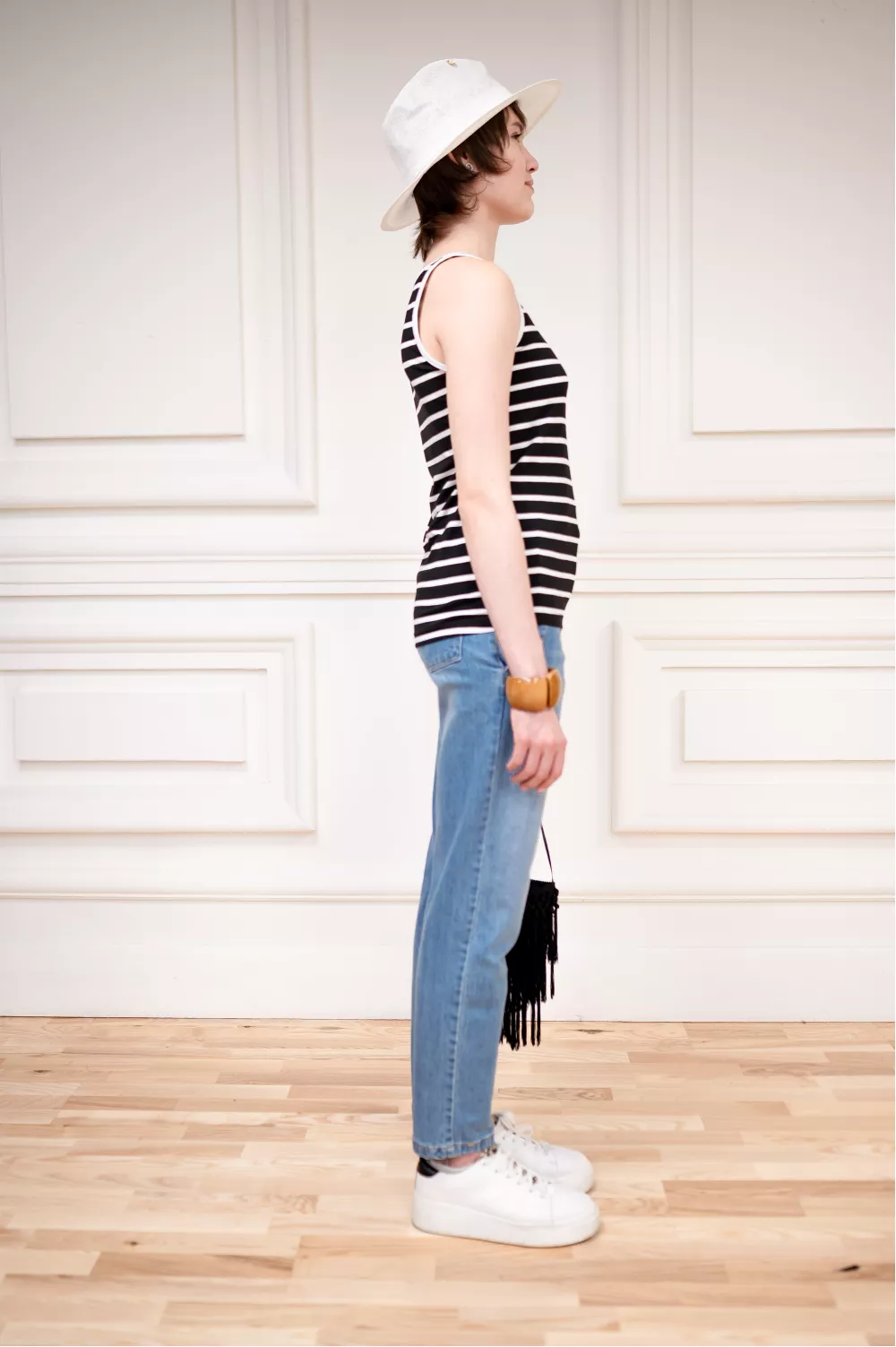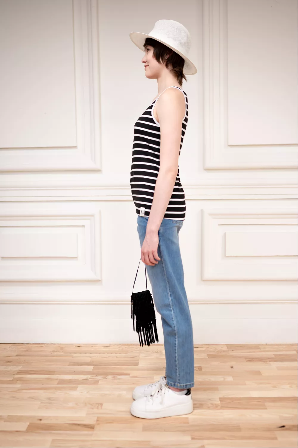 Базовая модель майки с широкой подтяжкой, обработанной дополнительно кантом. Со счет вискозы невероятно приятна к телу и может служить как отдельным элементом гардероба, так и дополнением образа под рубашку или жакет.