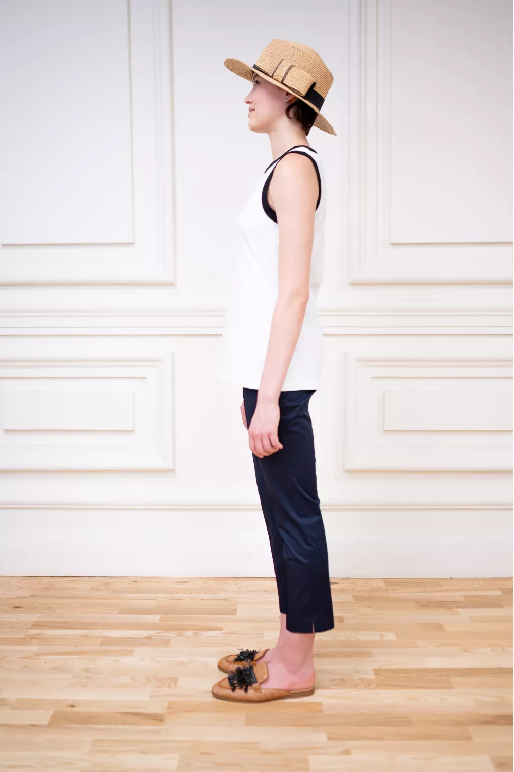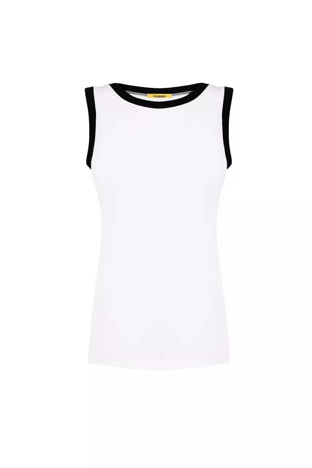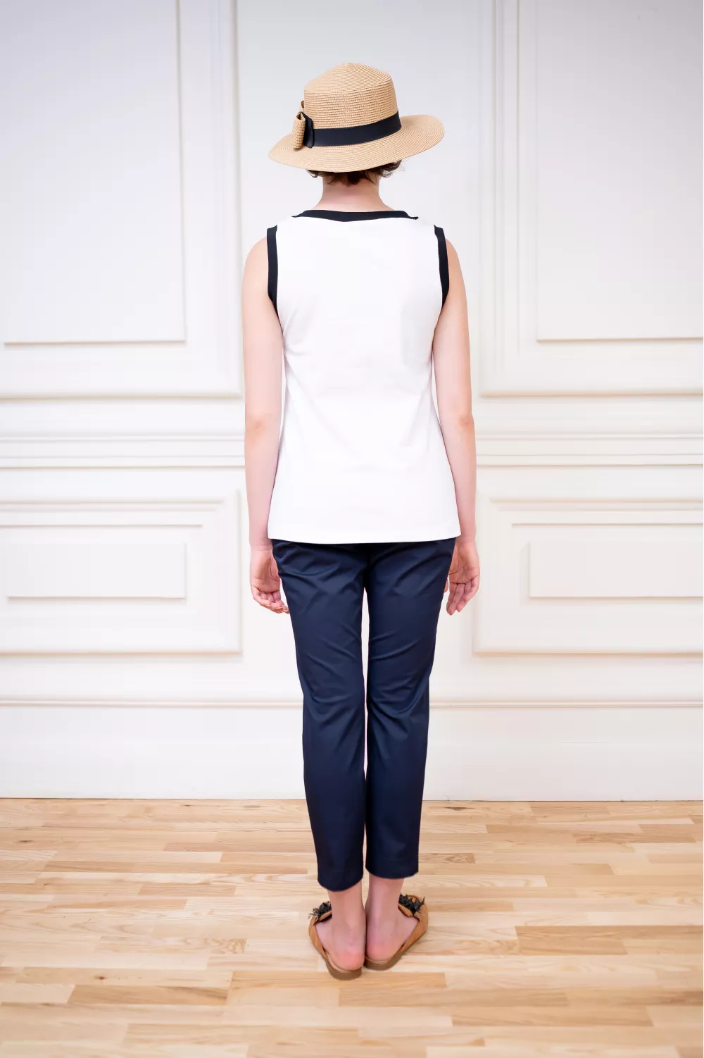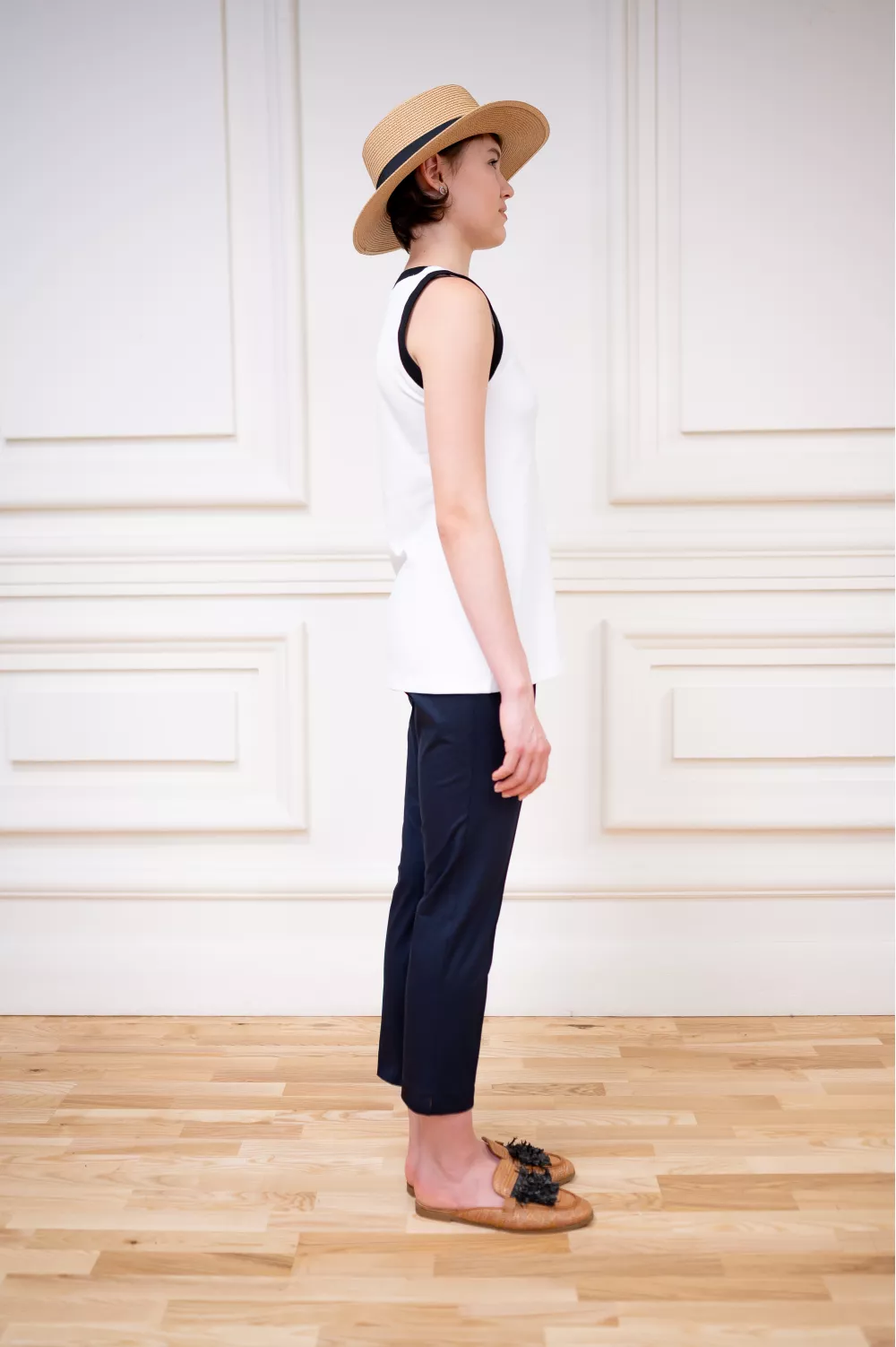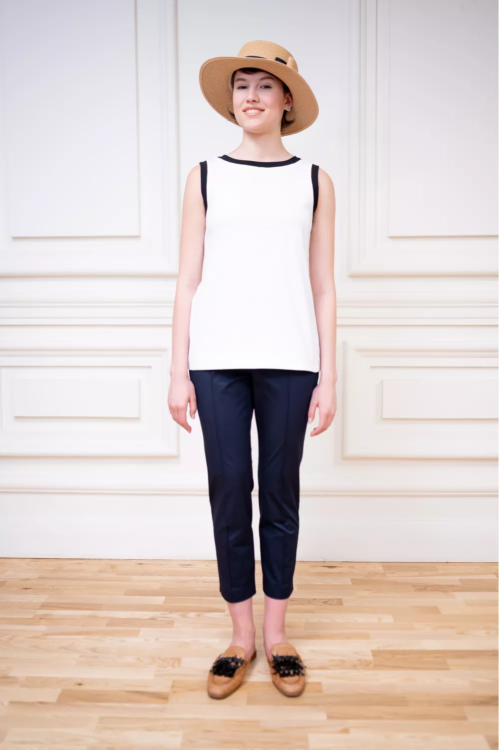 Базовая модель майки на широких бретелях, обрамленной широким кантом, прекрасно подойдет для ваших летних образов.