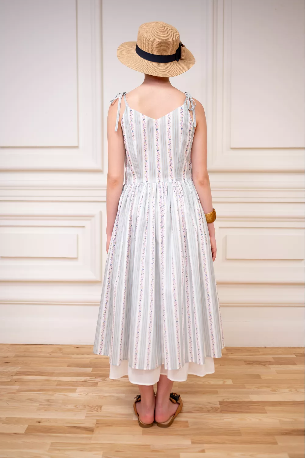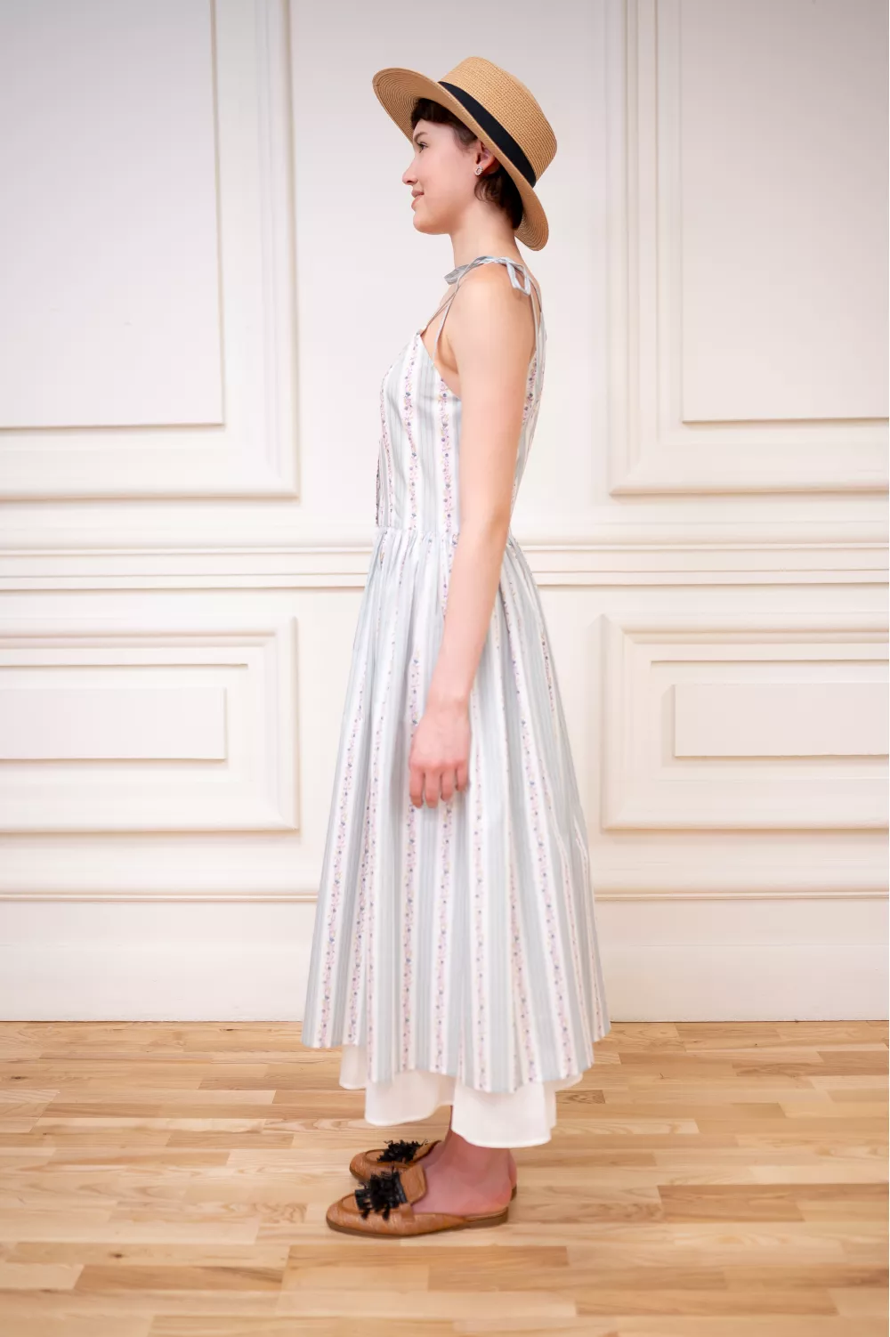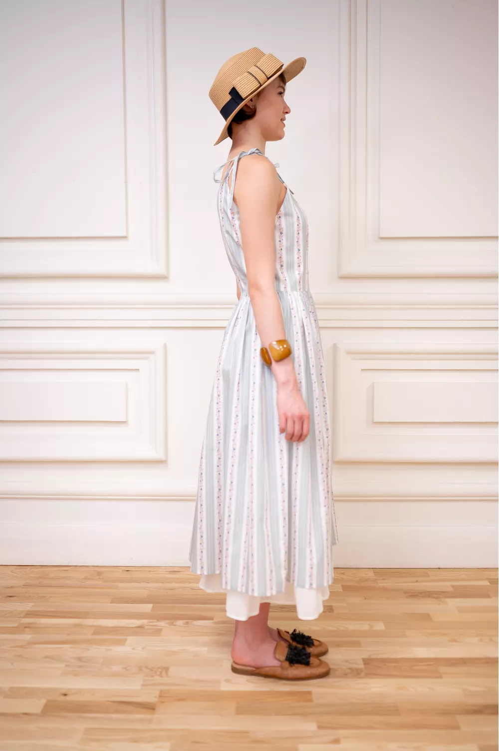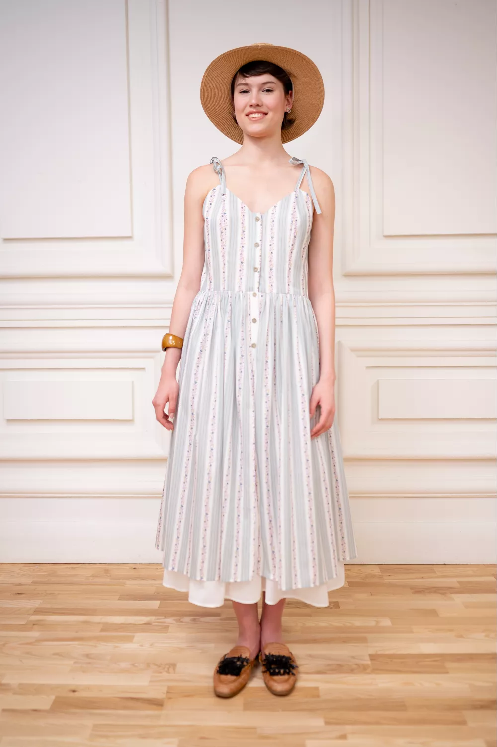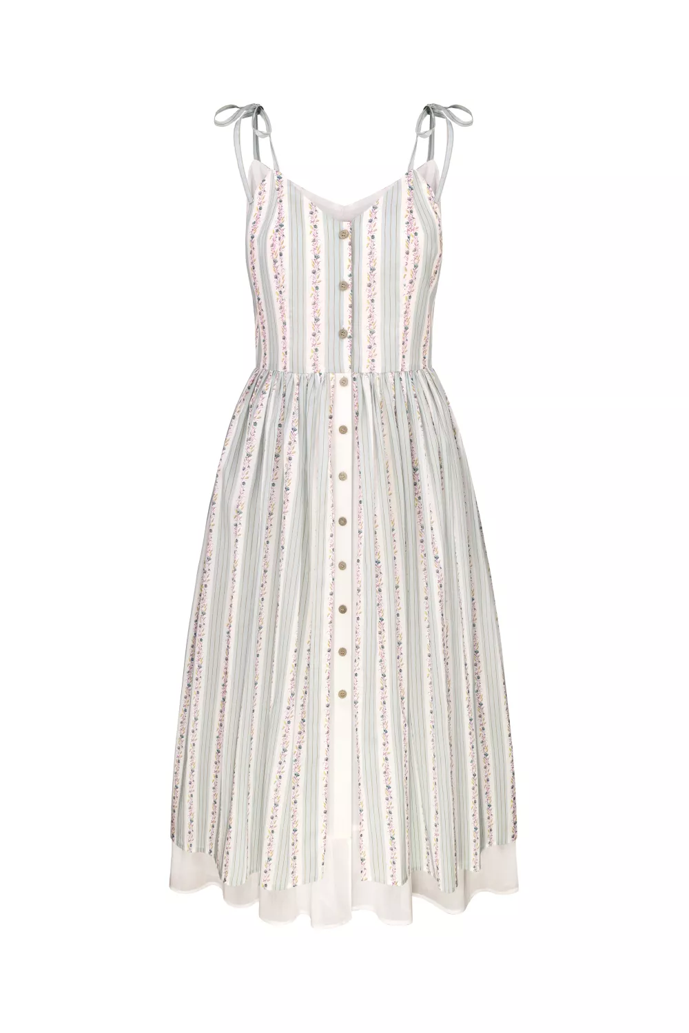 Сарафан на тонких бретелях в стиле прованс отшит из натурального итальянского хлопка имеет легкий вшитый подюбник на пуговицах и бретели на завязках, что придает модели романтического вида.