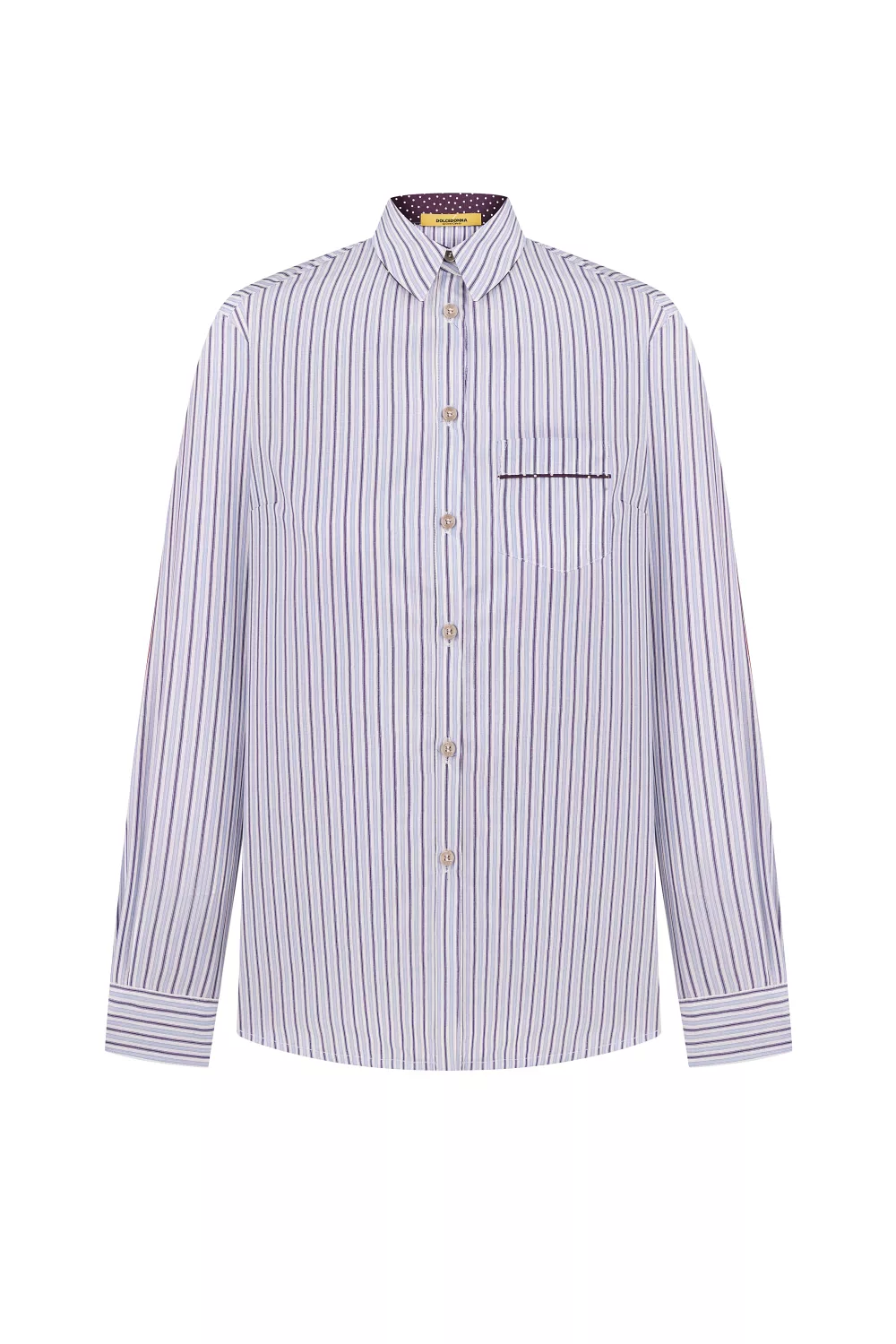 Классика, которая всегда актуальна. Эта рубашка из 100% натурального хлопка совмещает комфорт и современный стиль. Вертикальные полоски визуально вытягивают силуэт, а аккуратный воротник-стойка придает образу свежести и элегантности.