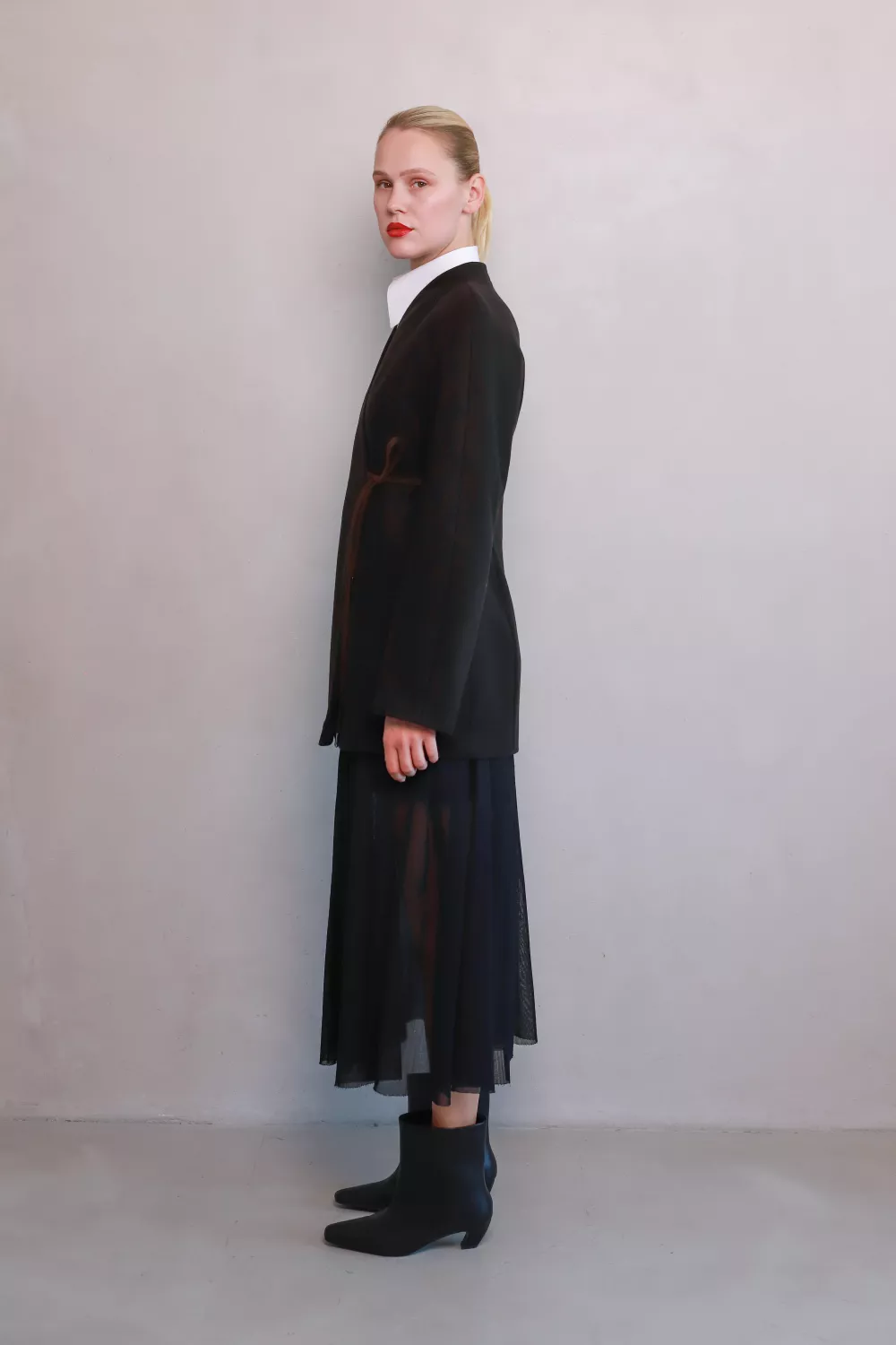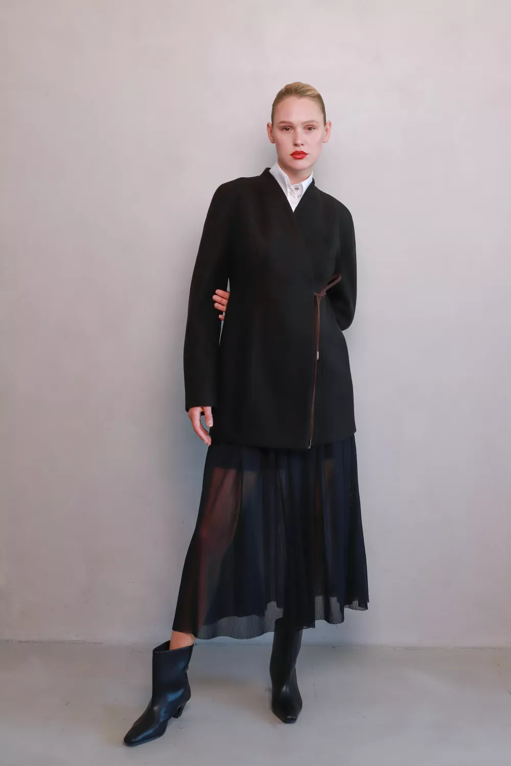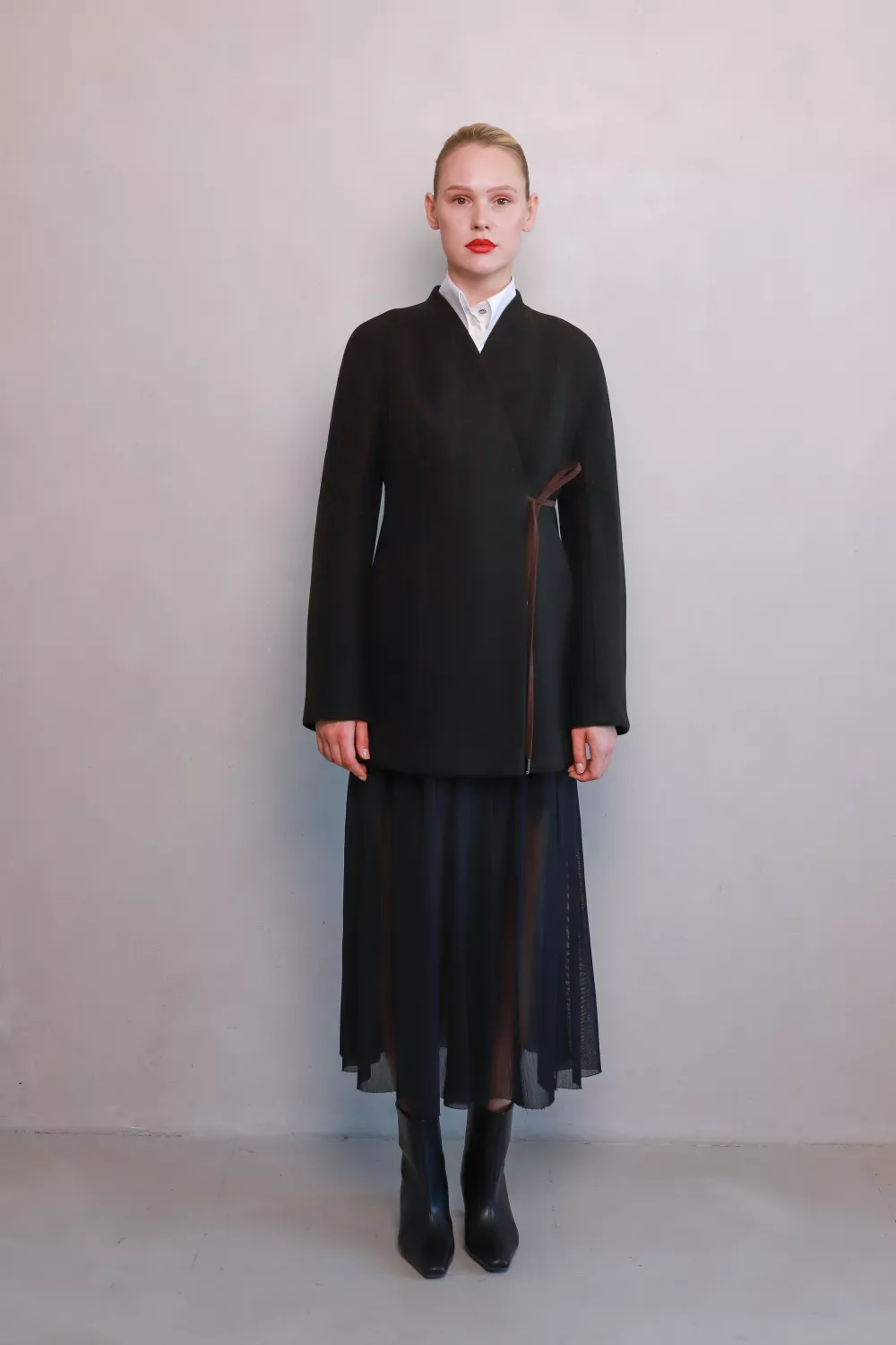 Утонченный жакет создан для женщин, ценящих минимализм и современную элегантность. Лаконичный крой без пуговиц подчеркнут аккуратным запахом и тонким поясом-завязкой, формирующим женственный силуэт.