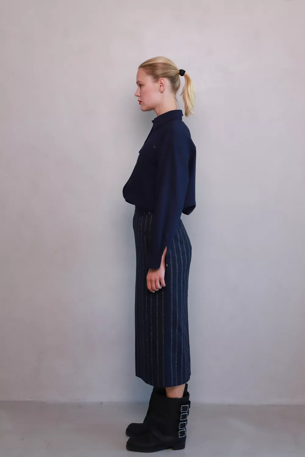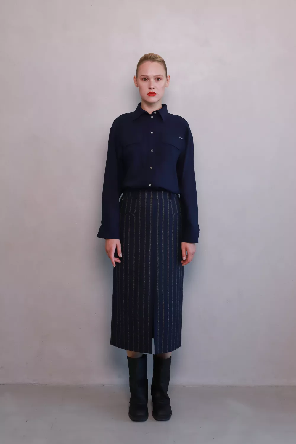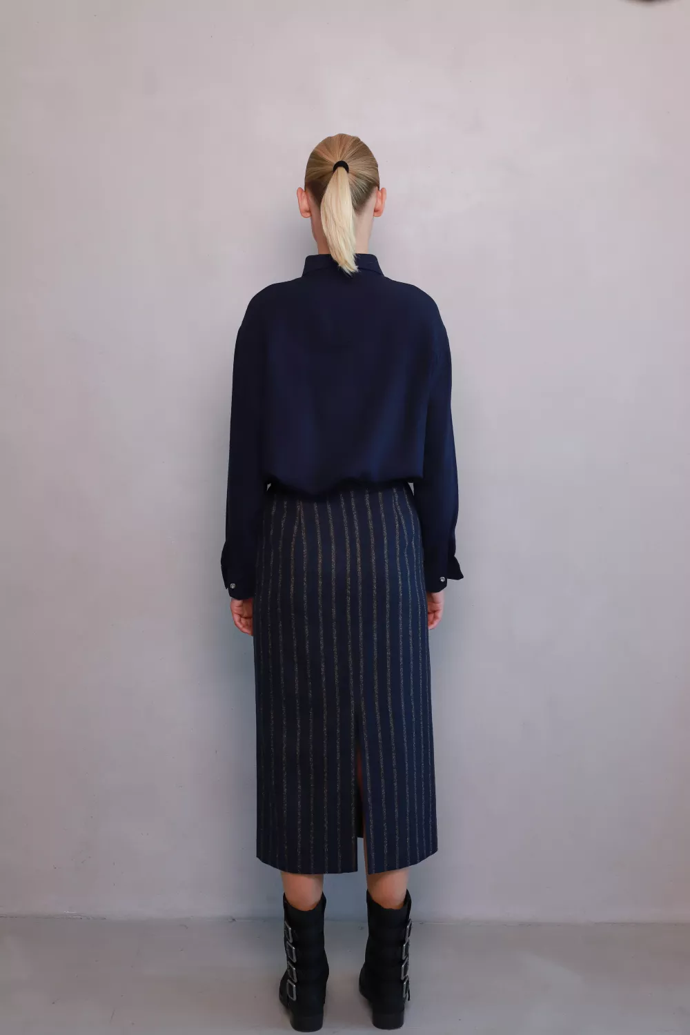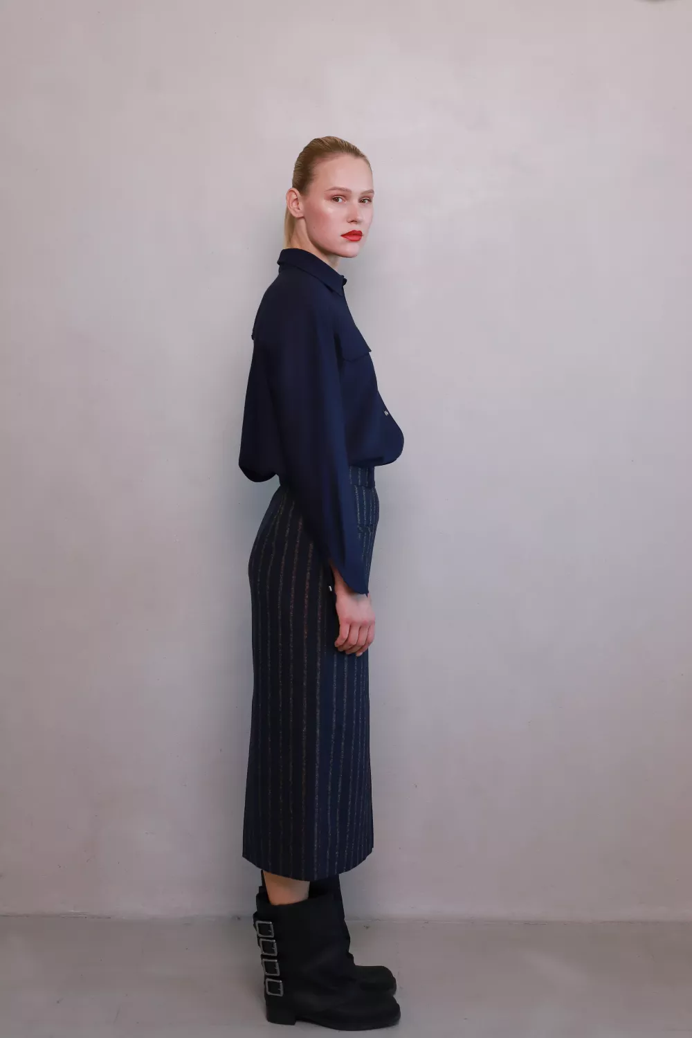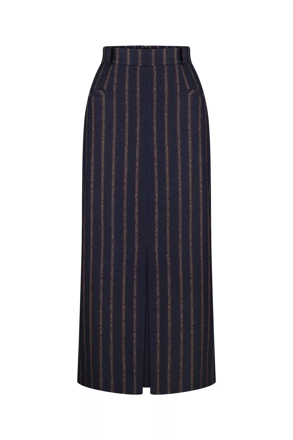 Вдохновение в атмосфере минимализма: юбка Керли – ваш новый базовый элемент с характером. Прямой крой в сочетании с благородной темно-синей гаммой и тонкой бежевой полоской создают гармоничный и изысканный баланс. Отдельным акцентом является элегантный разрез, придающий легкость и динамику в образ.