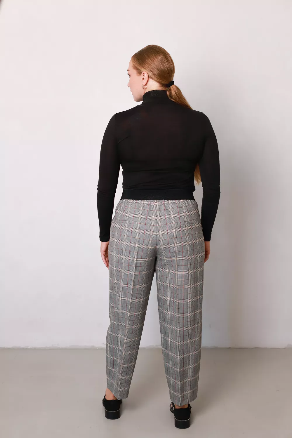 Шерстяные укороченные брюки на резинке серого цвета в молочно-черную клеточку Киото