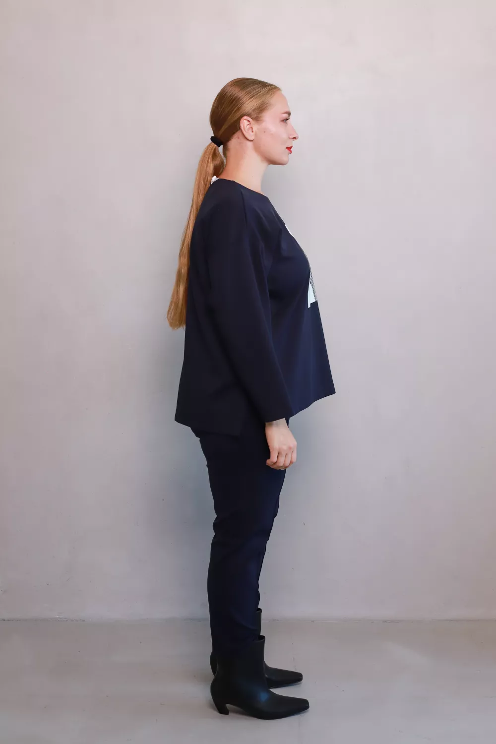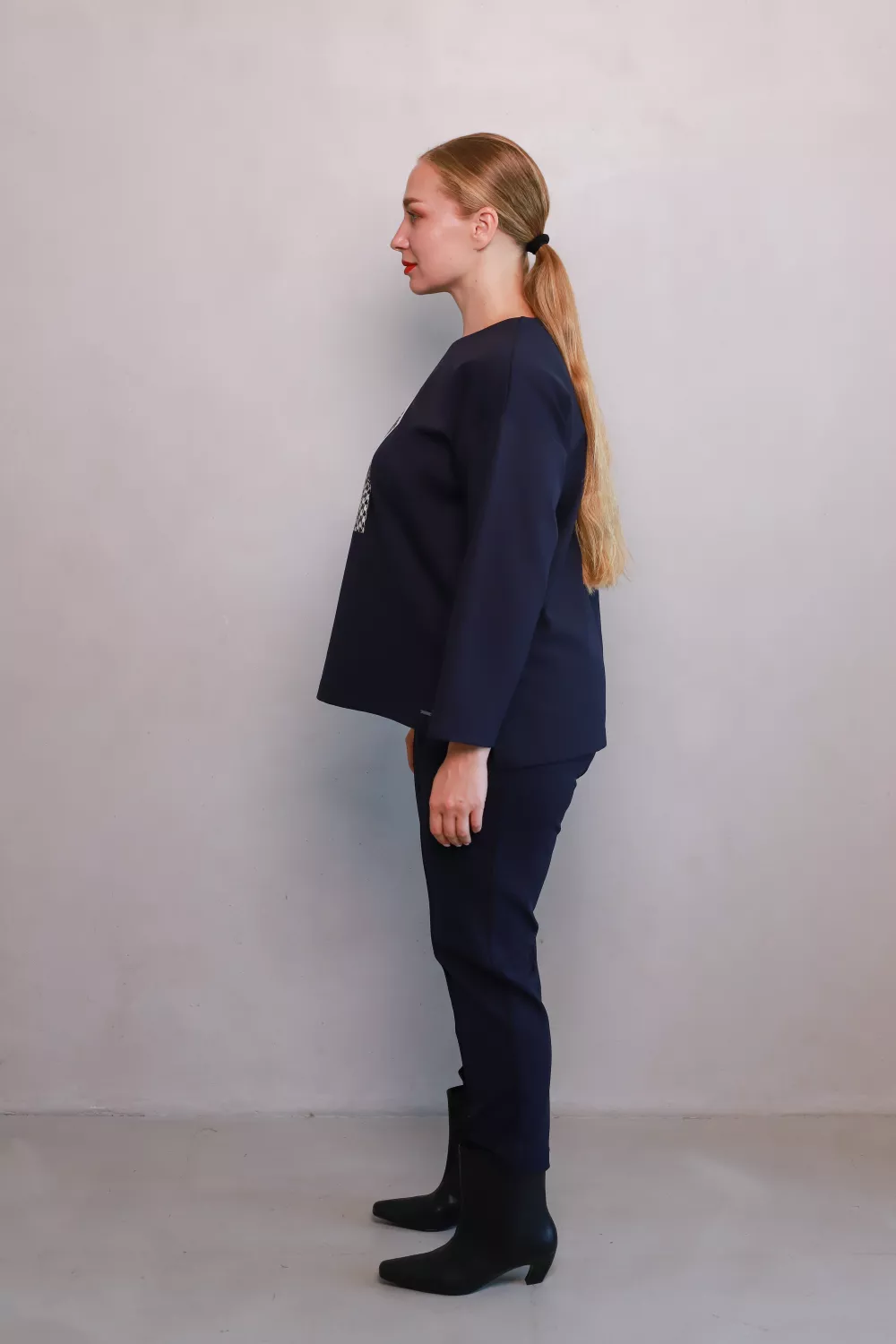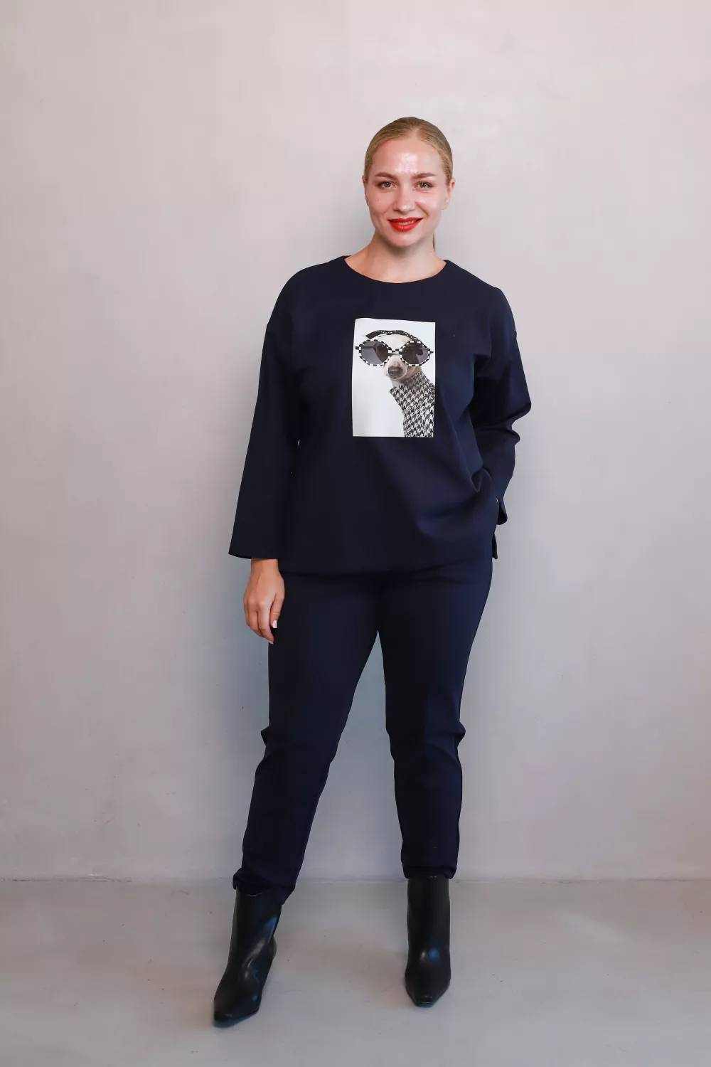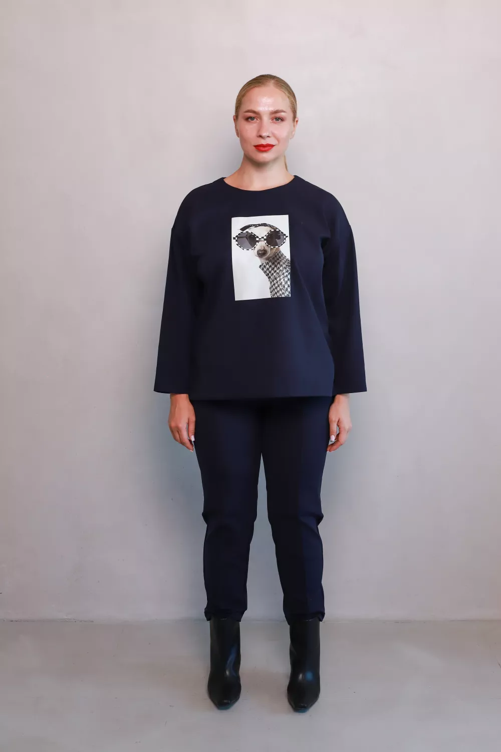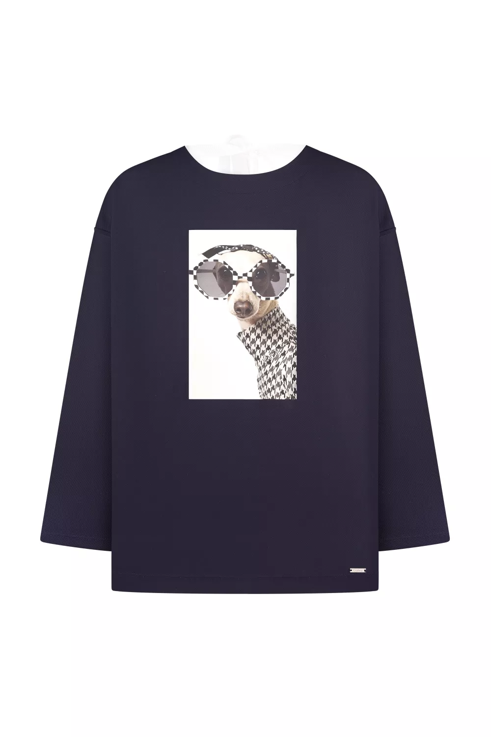 Темно-синяя кофта свободного кроя с завязками на спине и принтом собаки Колман