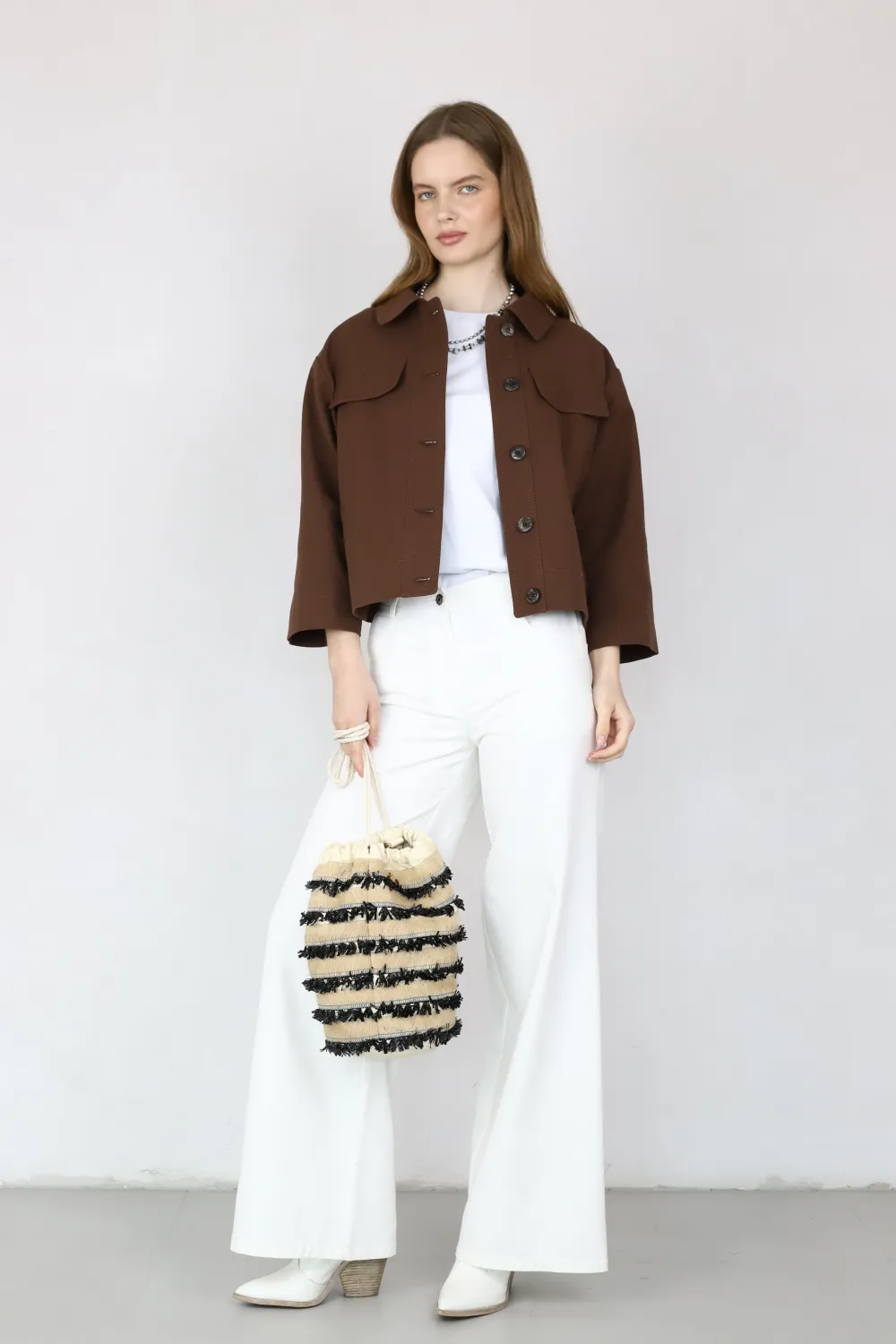 Жакет имеет прямой свободный крой и застегивается на ряд аккуратных контрастных пуговиц. Отложной воротник придает образу собранность. Спереди расположены два функциональных накладных кармана с клапанами, подчеркивающие утилитарный стиль.