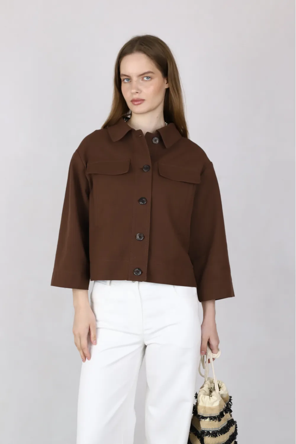 Стильный и универсальный укороченный жакет, выполненный в лаконичном дизайне куртки-рубашки (shacket). Модель изготовлена из плотного, качественного коттона.